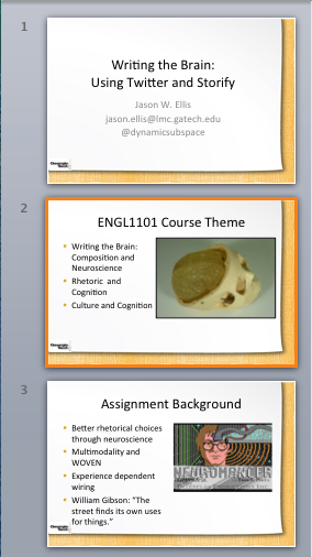 In this Recovered Writing post, I am including two PDF files that I used in my presentation on “Writing the Brain: Using Twitter and Storify” for the 2 October 2013 CETL Brown Bag Workshop. The first is my PowerPoint presentation file and the second is my handwritten presentation notes. Normally, I type up a carefully written script for my presentations, but in this case, I wrote my speaking notes out by hand. While I was driven my a tight deadline imposed by several other responsibilities converging at the same time, I saw this as an opportunity to experiment with a way of presenting that I normally don’t do and I wasn’t completely comfortable doing. As I tell my students, we grow by challenging ourselves, doing new things, and experimenting with new approaches. This was one such attempt on my part.