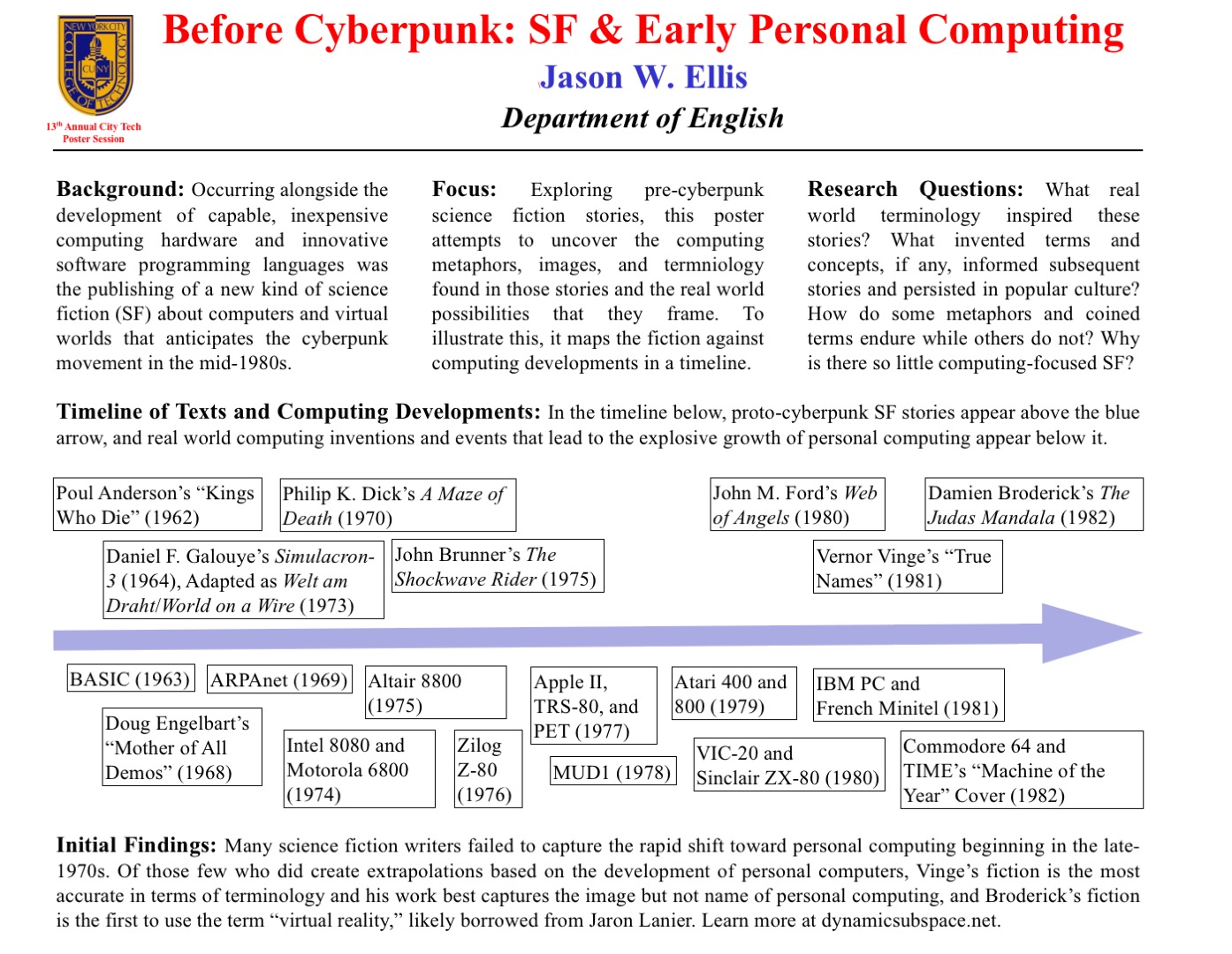For the New York City College of Technology, CUNY’s 13th Annual Research Poster Session, I created the poster embedded above to illustrate my current research on pre-cyberpunk science fiction (SF) about computing and personal computing. The poster discusses my focus and provides a timeline with SF about computing matched with key technological innovations that made the personal computing revolution in the late-1970s possible.