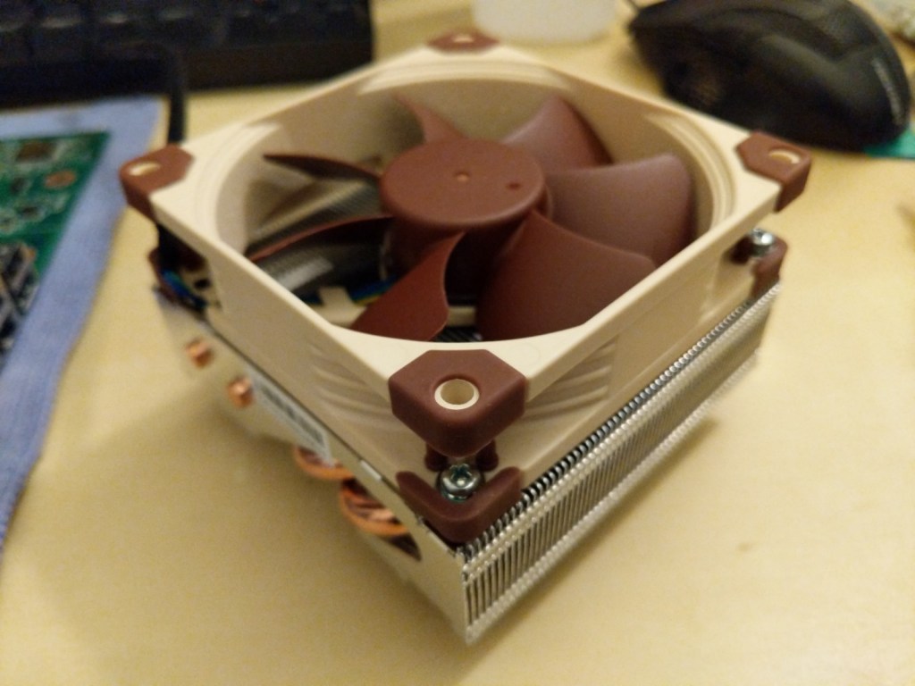 After removing the four screws holding the Silverstone fan to the top of the AR11 heatsink, I attached the Noctua NF-A9 with four fine-thread 3/8″ screws that I had on-hand. I attached the fan so that it would push air down and through the fins of the heatsink.