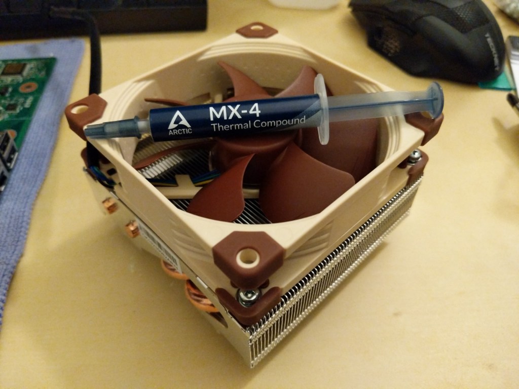 I hypothesized that the AR11 could perform better if it had more airflow (the AR11 comes with a Silverstone-branded 92mm x 92mm x 15mm fan that has straight blades and is nearly silent) and if it had better thermal conductivity (I had used the included disposable packet of thermal grease) between the CPU lid and the AR11’s four heat pipes.