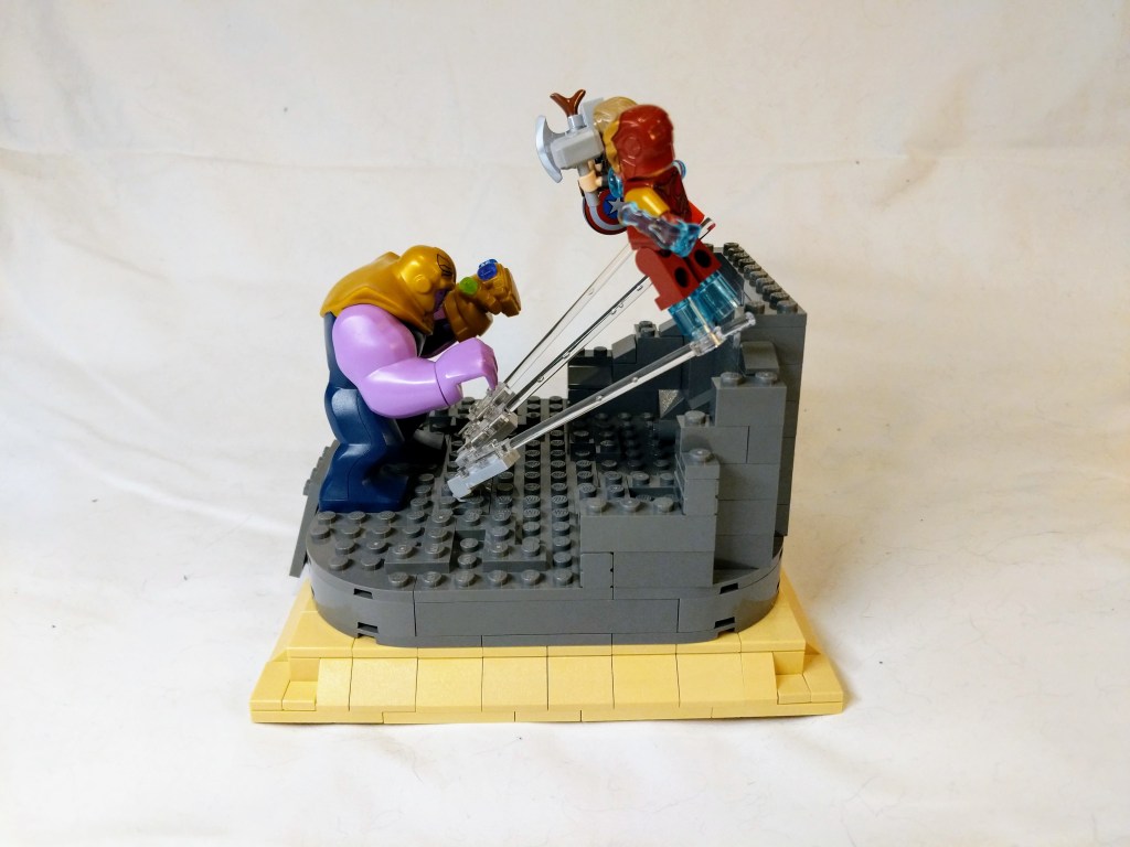 In the photo at the top of the post and in the photos below, you can see the second iteration of my MOC. About a week ago, I decided to return to the MOC after letting it rest on a bookshelf opposite my work area in our living room. My first concern was flipping the scene so that the villain’s back faces the audience and the heroes faces can be seen clearly from the front. This required a re-engineering of the Technic pin with ball joint assembly. Instead of having them project from bricks, I embedded the pins in the floor of the scene and I used Thanos’ body to obscure where the pins protrude from the ground. This also allowed for a more dramatic triangular positioning of the heroes so that they are focused toward a single point terminating at the figure of Thanos. Another reevaluation was with Thanos’ minifigure and weapon. In the first iteration, I used the newer Thanos minifigure from the 76192 set and a scaled down double sword weapon. In the revised version, I opted to use the minifigure from 76107 Thanos: Ultimate Battle equipped with the jewel-encrusted Infinity Gauntlet. Finally, I constructed a broken wall in the back of the scene to provide a backdrop and I built it with a tapering and cupped shape to envelop the scene and draw the eye back to the colorful figures of action in the scene.