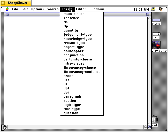 Below, I’ll annotate screenshots of the application running on an installation of Macintosh System Software 7.5.5 on the PPC emulator SheepShaver hosted by Debian 12 Bookworm with the Xfce Haiku Alpha window theme active.