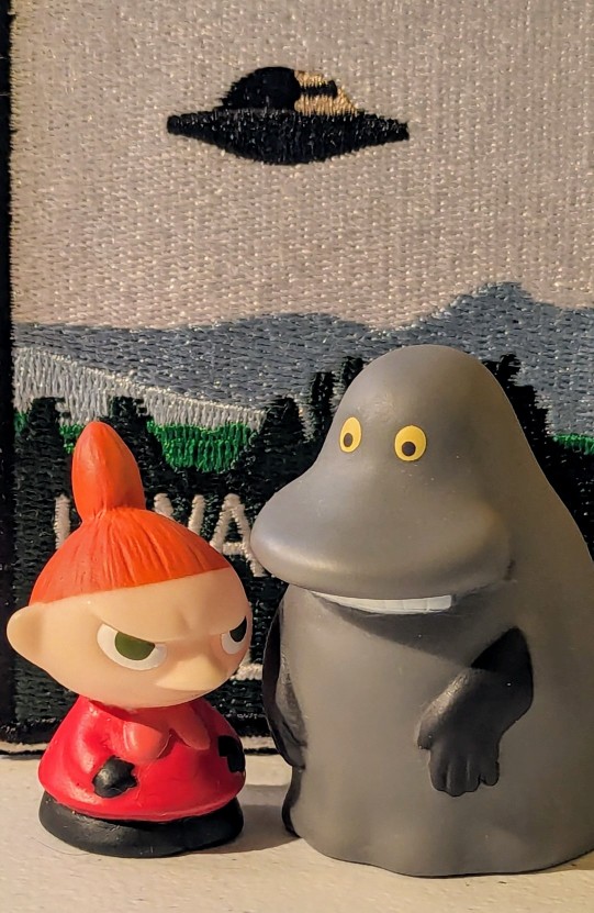 I was taking photos of objects on my desk and this configuration of Little My and The Groke from Tove Jannsen’s Moomin standing in front of Fox Mulder’s UFO poster from The X-Files gave me a chuckle. I thought, if only there had been a “The Moomins and the UFO” book. A quick Google search reminded me that there had been an episode of the Japanese 1990-1991 Moomin anime in which UFOs visited Moominvalley titled “A Close Encounter With Aliens.” A child alien visits, officialdom searches for him, the Moomin characters discover his technology, Moominmama is accidentally shrunk, Stinky steals the shrink ray machine, it is destroyed, and the child alien’s parents show up to collect their little one and set things right. I want to believe (in Moominvalley).
