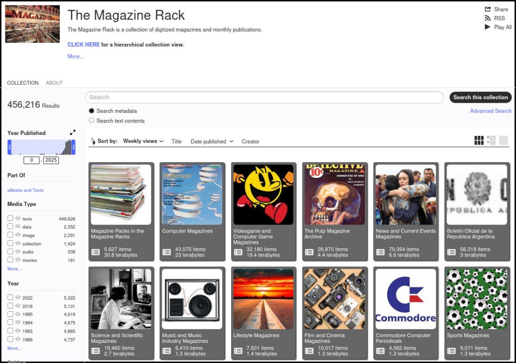 The Internet Archive has a tremendous collection of magazines across all disciplinary possibilities. Most are contained in The Magazine Rack. You can read them online, download them individually, or bulk download them using Jeff Kaplin’s instructions from 2012. Though, I have modified Kaplin’s wget command when files stopped downloading due to changes at archive.org, wget, or both: