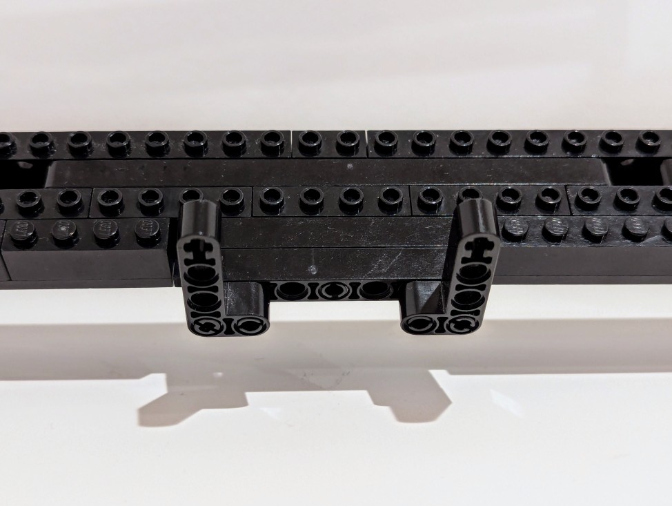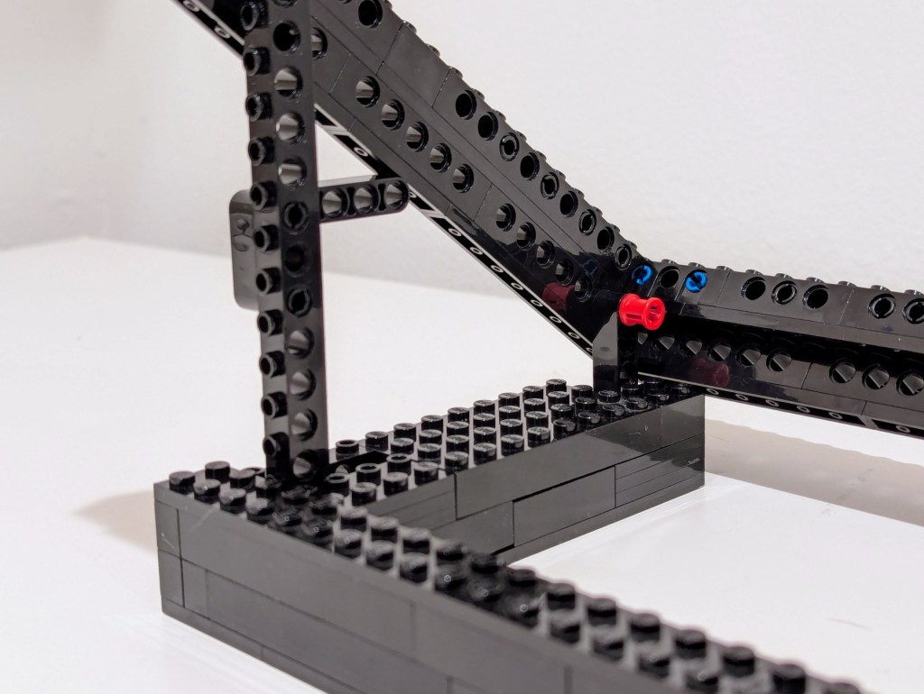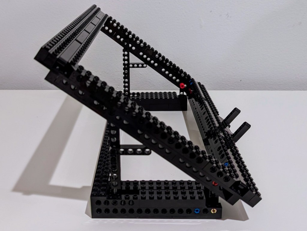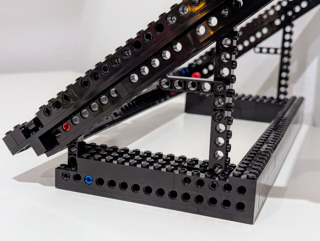 I started by disassembling the folding stand that I had built in 2024, but I noted how I sandwiched a Technic beam between two Technic bricks. The beam’s lower dimension provided a smooth shelf for the laptop’s feet to rest on and the studs on the bricks kept the laptop from sliding off the beam toward the front or rear. I planned to replicate this design in the new laptop stand.