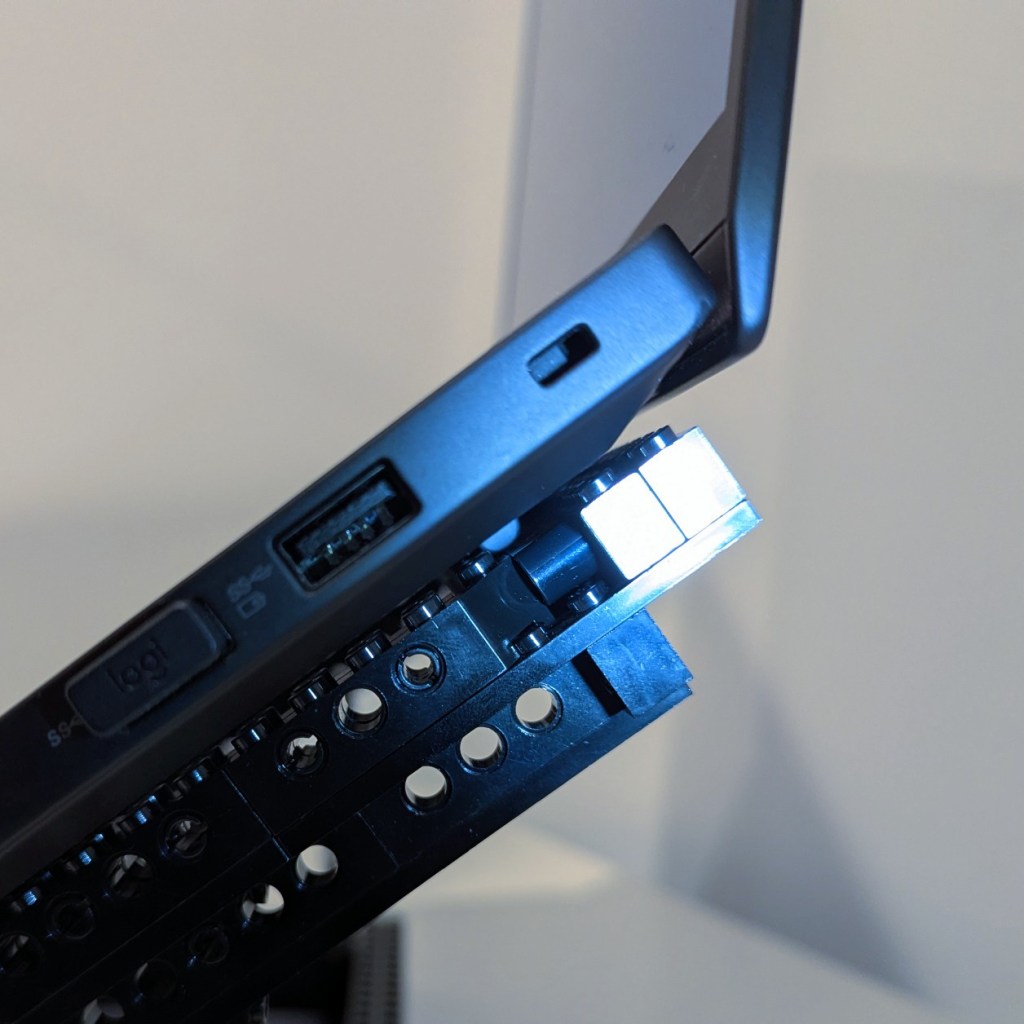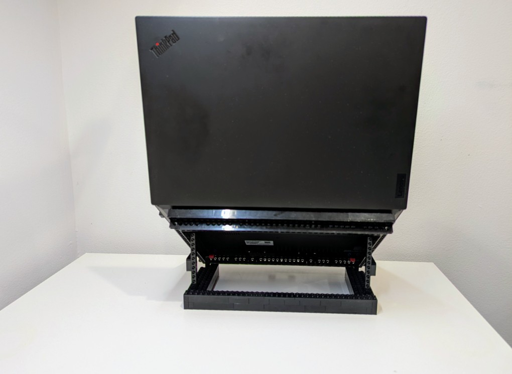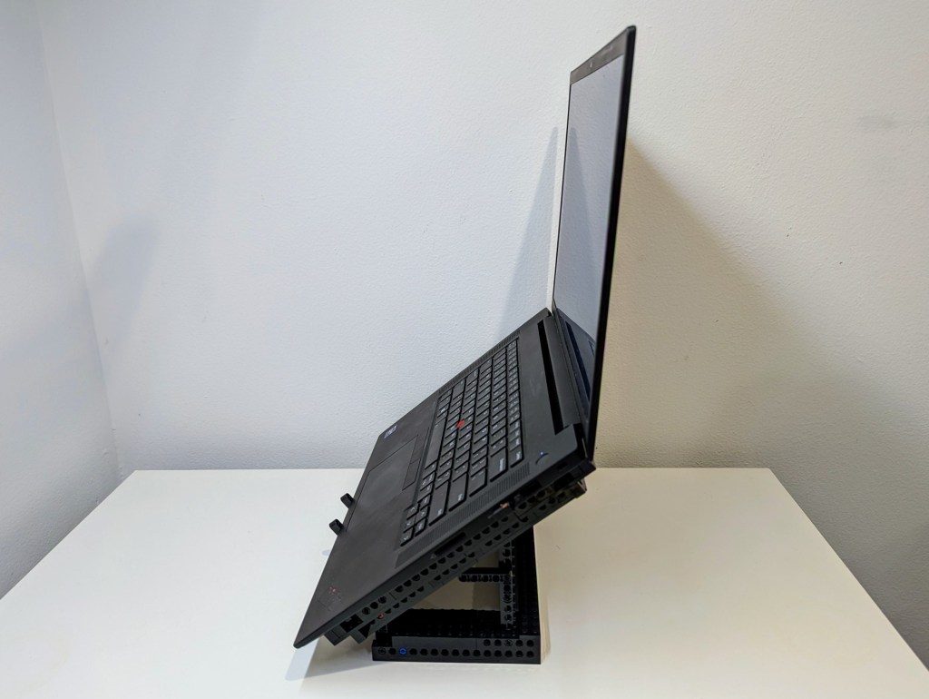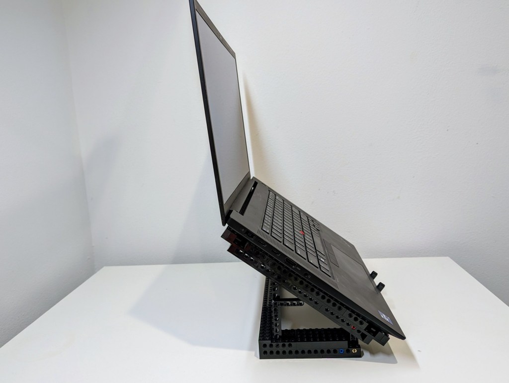 I’ve been using my Lenovo Thinkpad P1 Gen4 laptop as a desktop replacement system lately, so I wanted to raise its screen higher to avoid slouching and subsequent neck and shoulder pain. While there are lots of solutions to buy, I opted to use the LEGO Technics that I had on hand to build a stand. My goals for the project were facilitating maximum air flow and reliably holding a 4 lb. 5 oz. laptop.