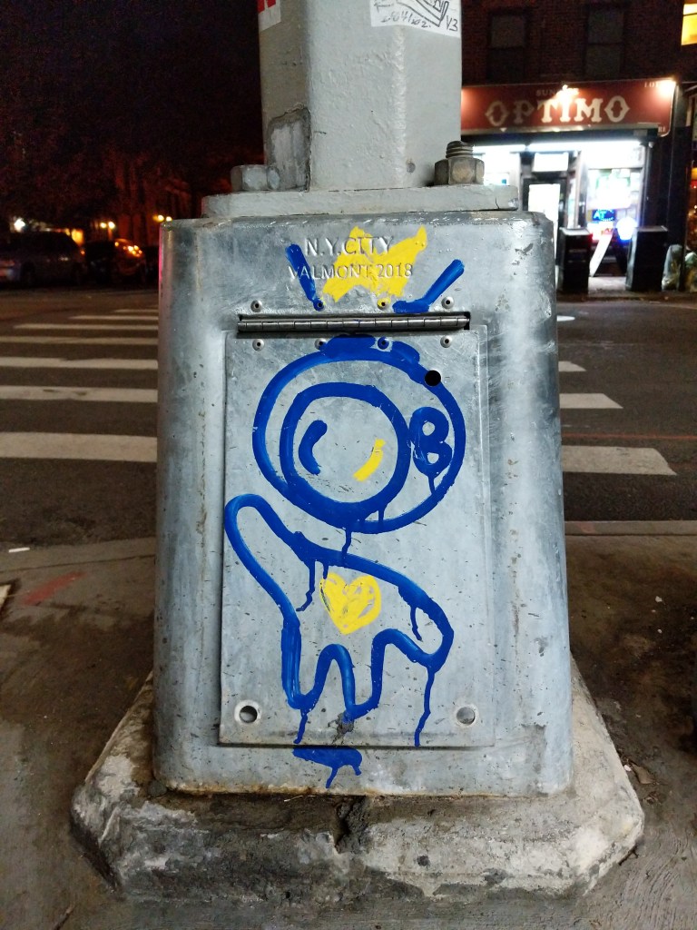 I took these photos of DntWatchTV street art around Carroll Gardens in late-2019 and mid-2020. It’s a cute character that resembles a spaceman emblazoned with a heart but the helmeted head looks like a retro television set with rabbit ear antennae and a little electric spark across the gap. If the intent is to get people to tune out their televisions, I hope that they caught people’s attention and got them to consider it.