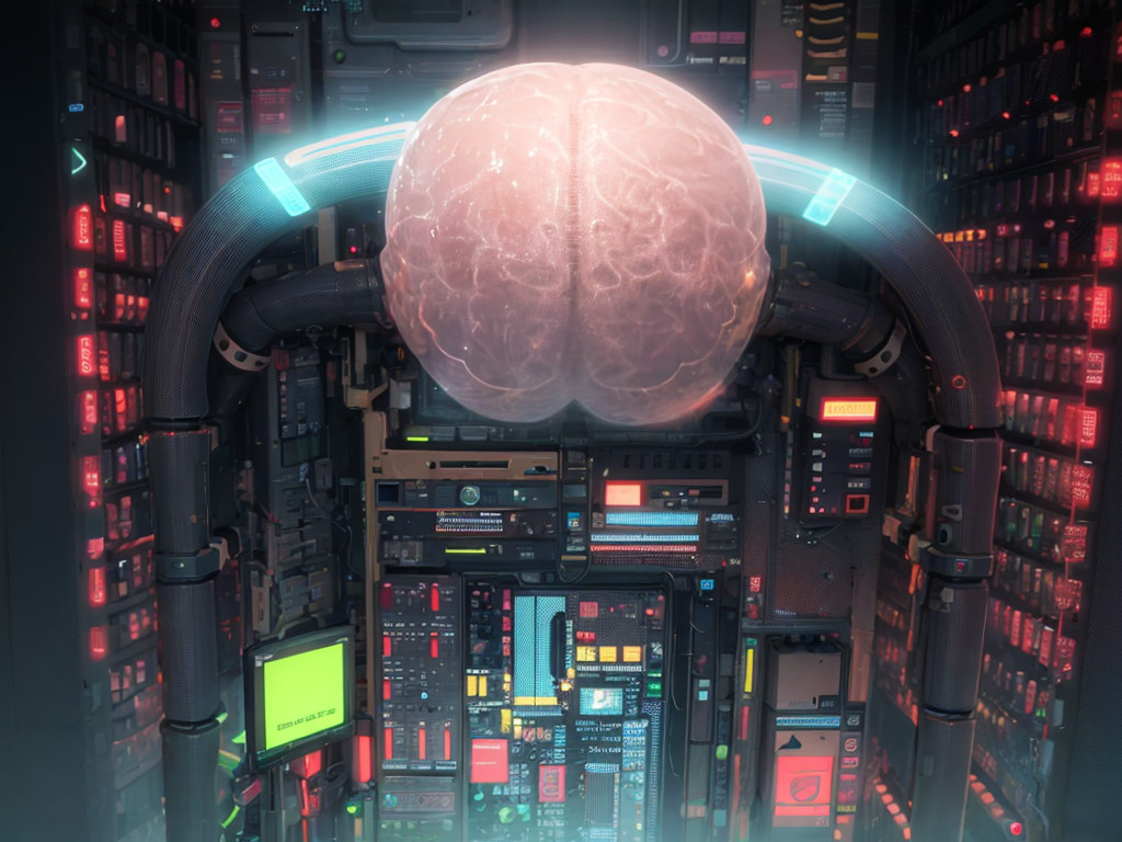 These images are called Brain in a Box 1, 2, and 3. The idea behind them was a electronic-organic computer assemblage that fit into a 19″ server cabinet. The brains are modeled on my fMRI scans, and the background cabling and box perspective come from another controlnet layer using a snapshot of a networking setup with bundles of ethernet cables. The lighting details and computing element details varied based on my prompt.