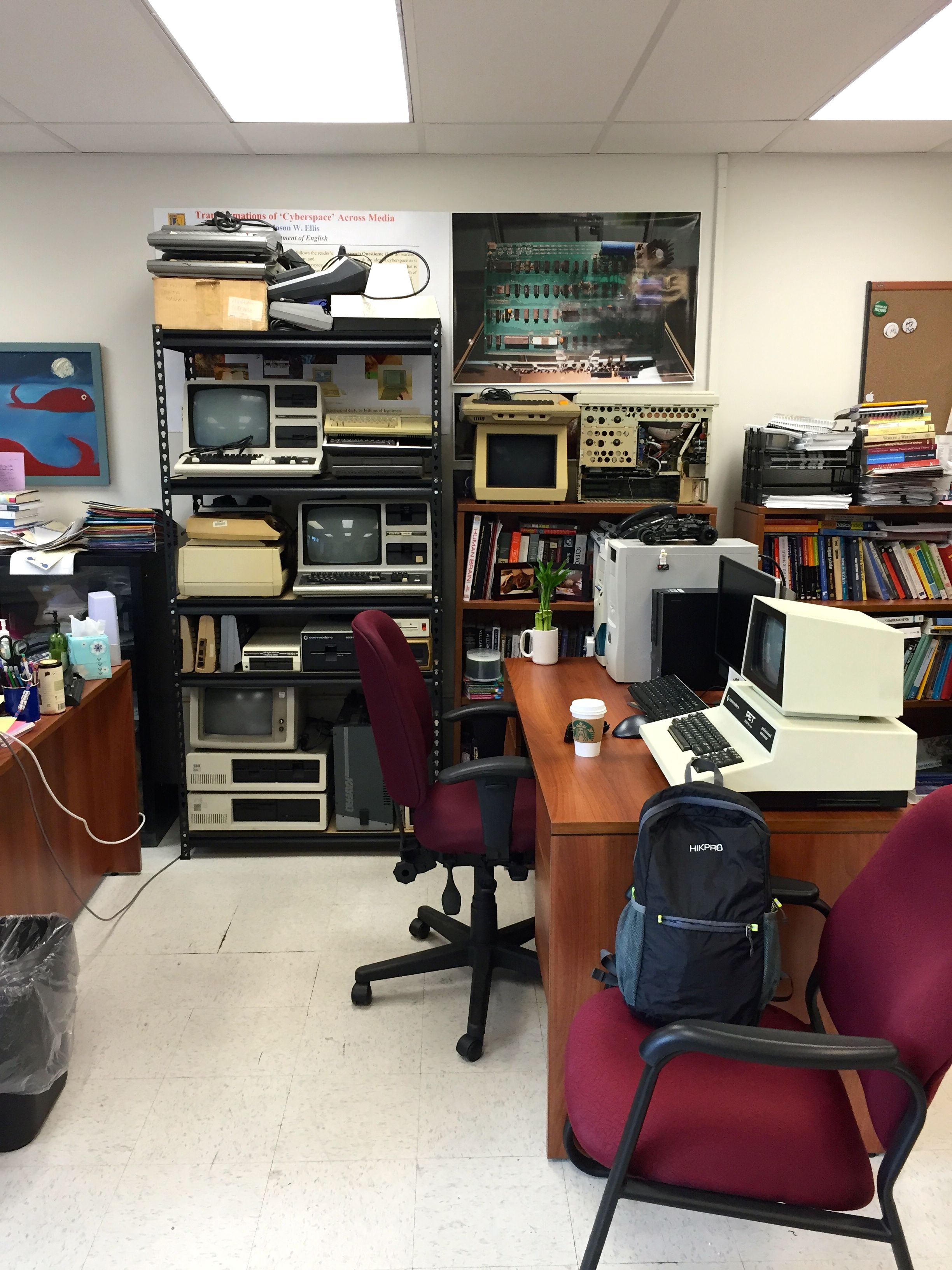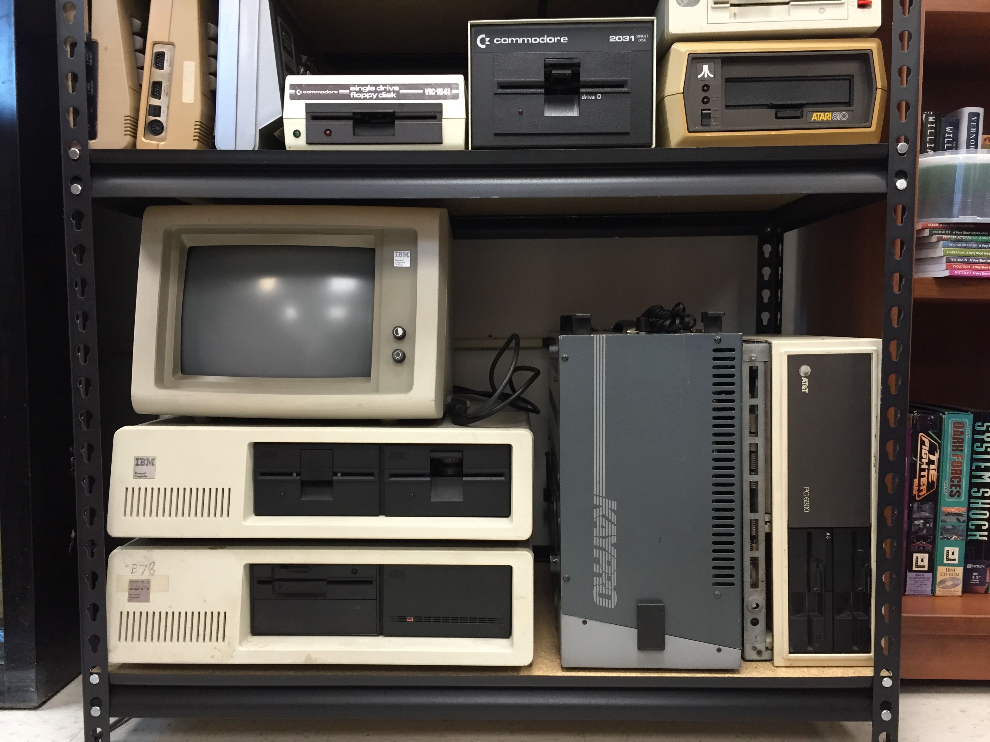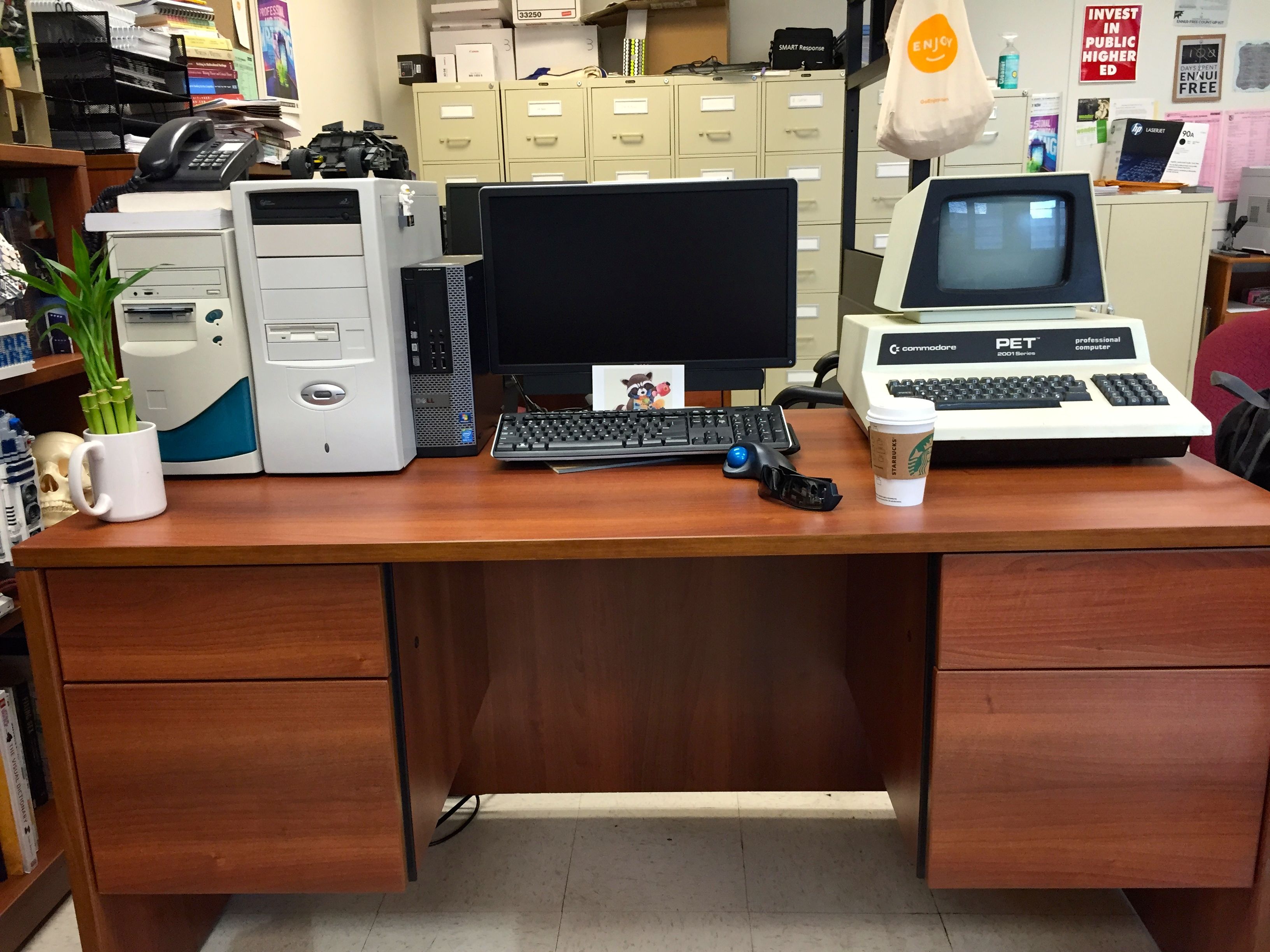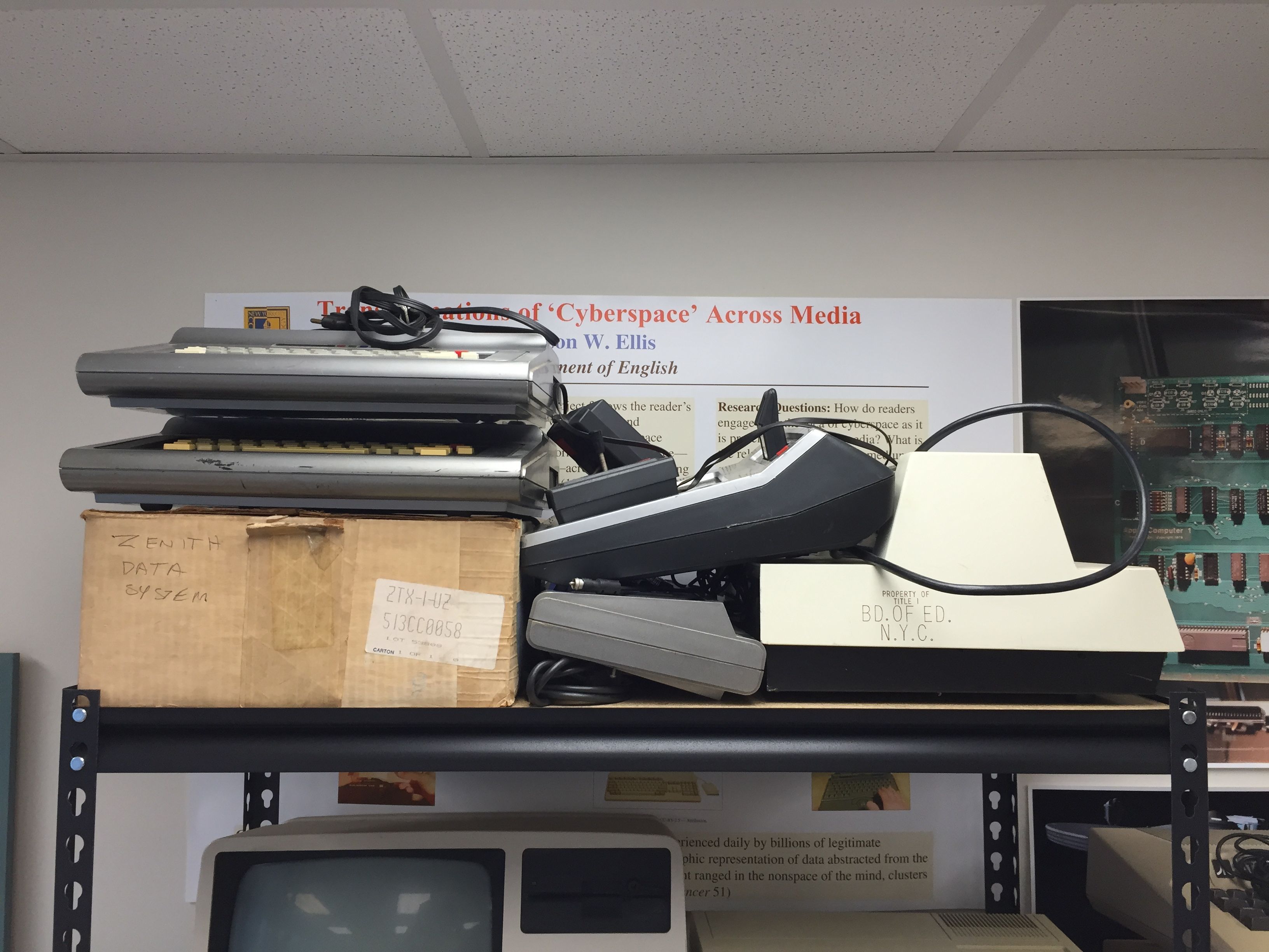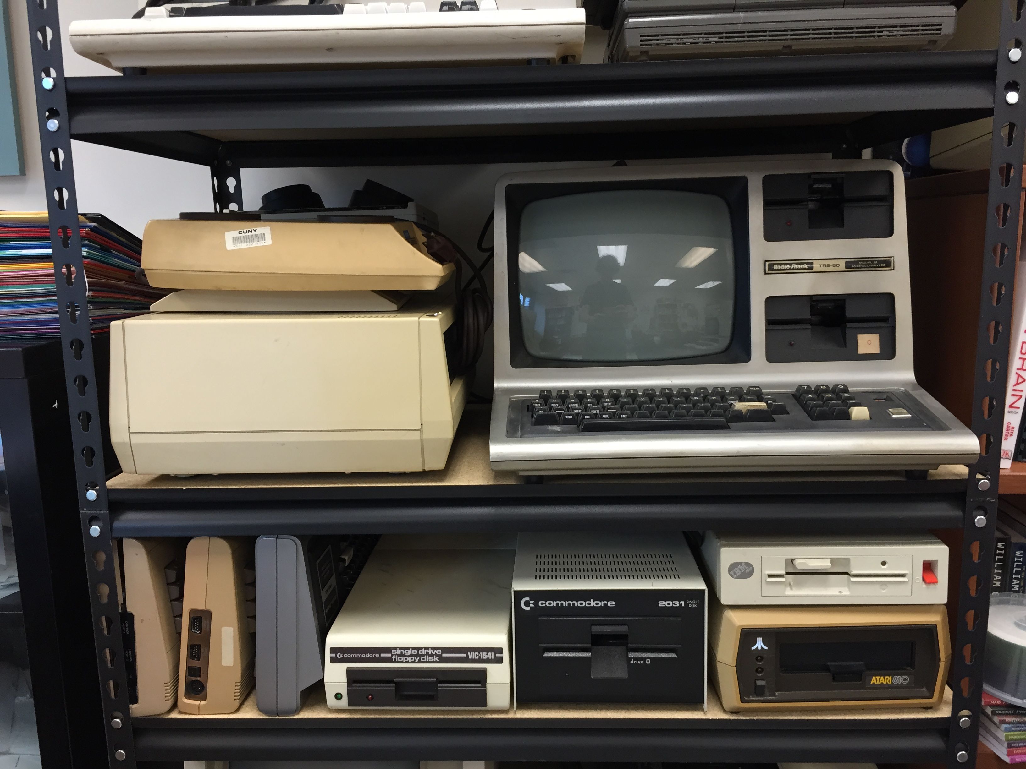 Thanks to City Tech’s Stanley Kaplan, I now have a substantial new collection of early personal computers including IBM PCs, Radio Shack TRS-80s, a Commodore PET, Texas Instruments TI-99s, ATARI 800, and a number of other computers and peripherals in my office in Namm 520. Some of the smaller items are locked in my filing cabinet, but as you can see from the photos included in this post, I have the larger items arranged around my desk and on a new set of Edsal steel shelves that I purchased on Amazon.com. Now, I have to make some additional room for a large, removable magnetic disk from a TRIAD Computer System (c. late-1970s~early-1980s, the drive that reads this disk was about the size of a washing machine) and an Apple Macintosh Centris 650, which I shipped to myself from Brunswick when I recently visited my parents. In the coming months, I will catalog these machines, see what works, and plan how to use them (research, pedagogy, and exhibits). If you have older computers, disks, or user manuals and would like to donate them for use in my research and teaching, please drop me a line at dynamicsubspace at gmail dot com.
