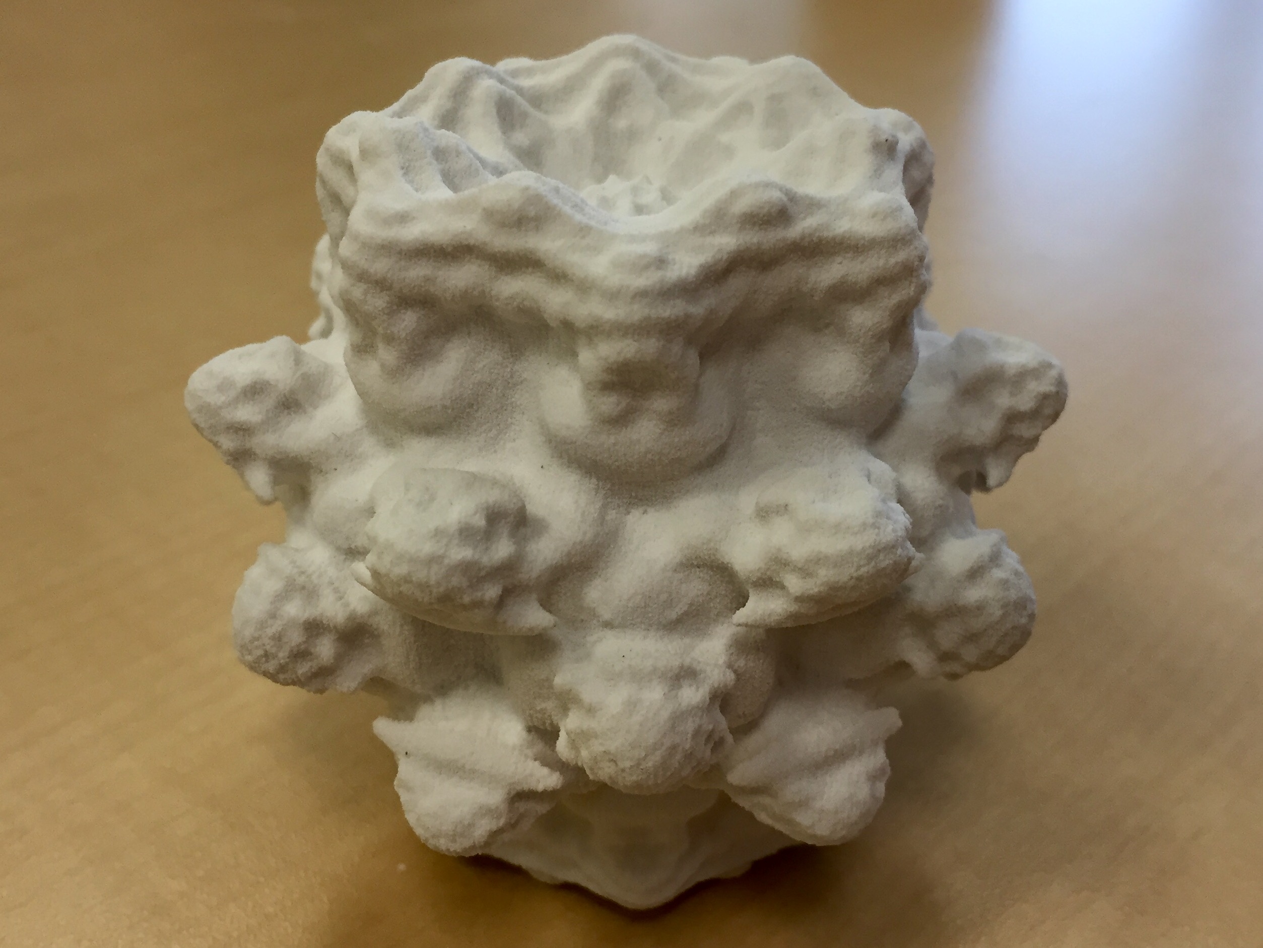 This is a 3D print of a Mandelbulb that I created with Mandelbulb3D, Fiji, and meshlab.