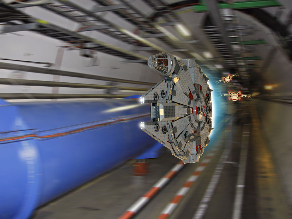 This is a very rough cut of an image that I’ve had in mind to make for awhile, but I thought I would show off this early draft. There’s a poster of the Falcon flying into the heart of the second Death Star in ROTJ, so I thought I could recreate it with Lego. I pulled this image of the LHC tunnel 1 and applied a motion blur. Then, I cut out photos of my 4504 Millennium Falcon and 6212 Luke’s X-Wing Fighter. I added engine effects and lights to the front of the Falcon. With more time and effort, I believe that I can turn out a very nice composite reproduction of the ROTJ poster. Though, I will need to take a new picture of the Falcon with Billie Dee and Nien Numb at the controls. If you know of a better tunnel image with exposed pipes, please mention it in the comments.