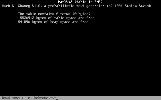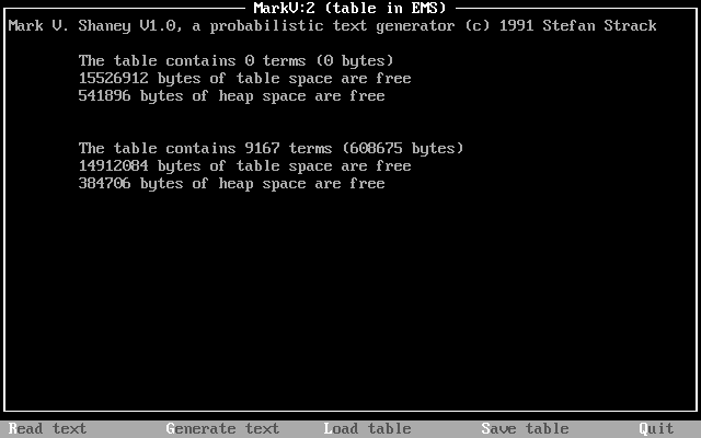 Pressing “S” gives the user an option to save the table for future use. I went with the default name, MARKKOV.MKV (not to be confused with a modern Matroska container file). This file can be loaded in MARKV.EXE on subsequent runs by pressing “L” and entering the name of the table. When the user presses “Q”, the program exits back to DOS and displays a message, “The random number seed was x,” where x is a random number used in the generation of text. If repeatability is important to the user, you’ll want to make a note of that number and use it with the -s modifier when running MARKV.EXE again (e.g., markv.exe -s2510).