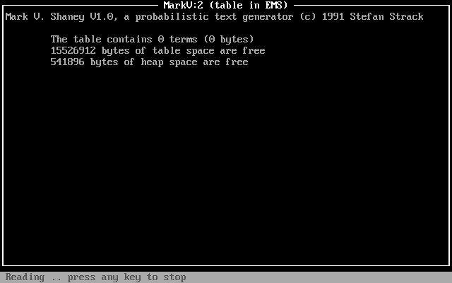 The program works by the user feeding a text into MARKV.EXE, which is “read.” This generates a hashed table of probabilistic weights for the words in the original text, which can be saved. The program then uses that table and an initial numerical seed value to generate text until it encounters the last word in the input text or the user presses Escape. The larger the text (given memory availability) , the more interesting its output text, because more data allows it to generate better probability weights for word associations (i.e., what word has a higher chance to follow a given word). Full details about how the program works can be found in the highly detailed and well-organized MARKV.DOC file included with the executable.