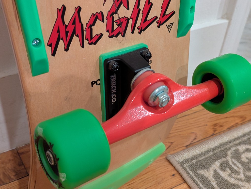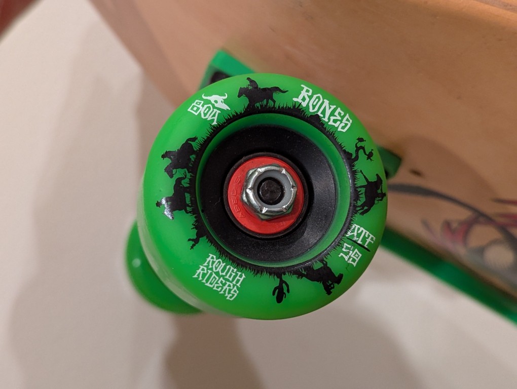 I drilled the four holes with a 7/16″ bit and installed the wheels with the 3/8″ bolts with a washer on top, a washer on bottom, and two nuts per bolt.
