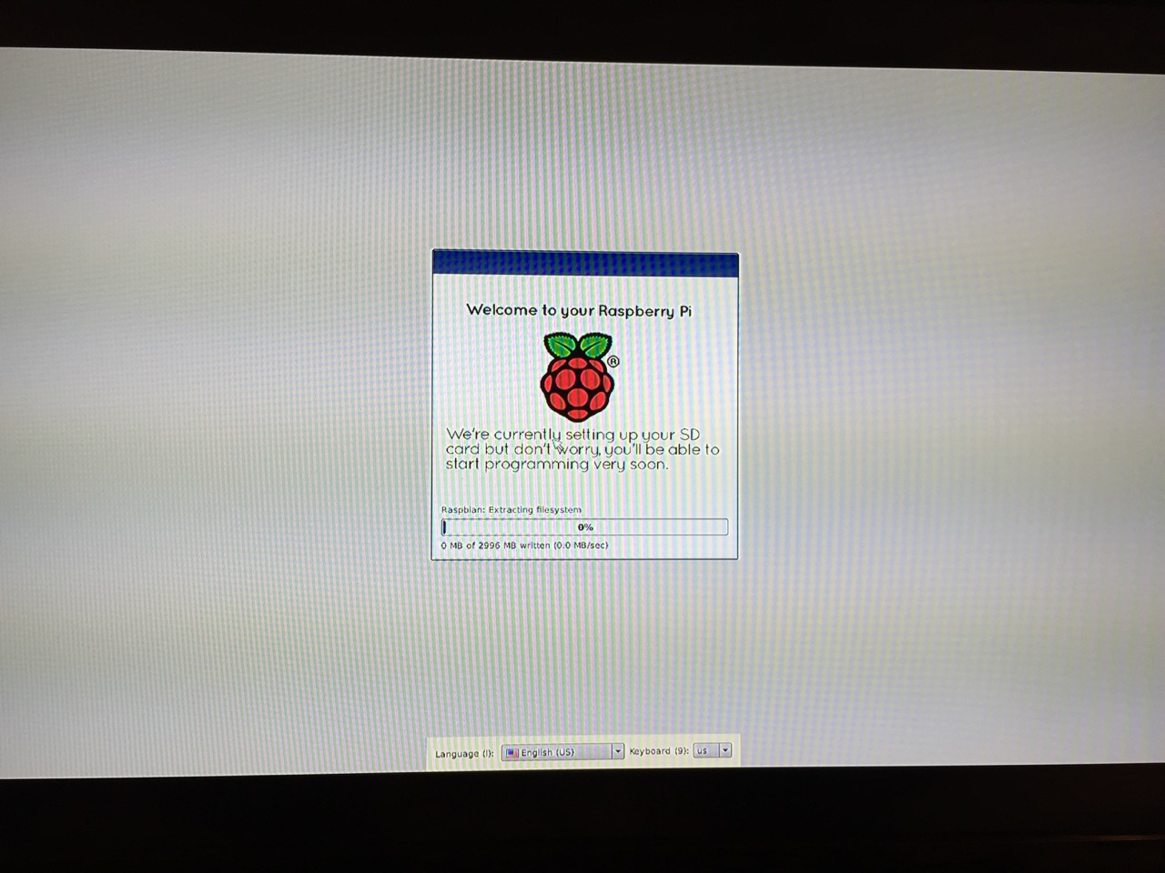 Next, connect the Raspberry Pi to a display (such as a TV) with HDMI, and plug in the wifi adapter and wireless keyboard into two available USB ports. Alternatively, you can connect the Raspberry Pi to the Internet via ethernet and to a wired keyboard and mouse. Then, connect it to the 5v power supply. As soon as it is plugged in, the Raspberry Pi is turned on and operational. It will begin to boot from the micro SD card’s NOOBS installer, which will guide you through the process of installing Raspbian. See the images below to see what this looks like and what choices you should make for a basic installation.