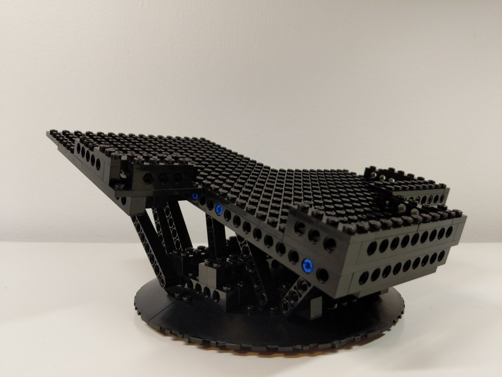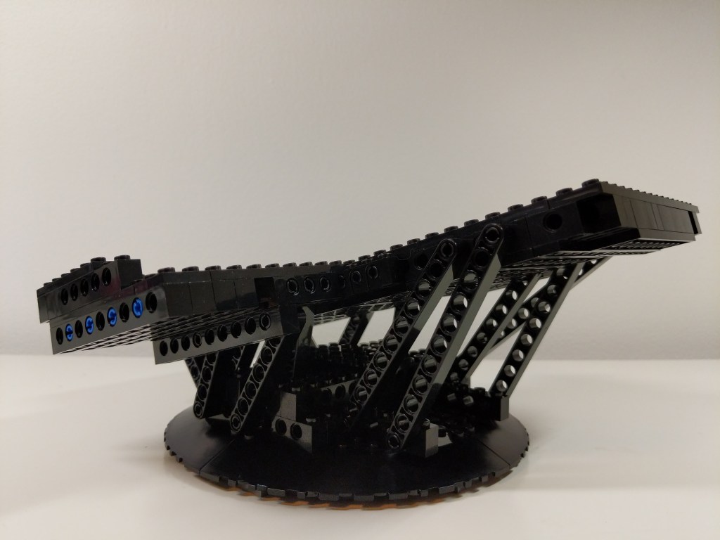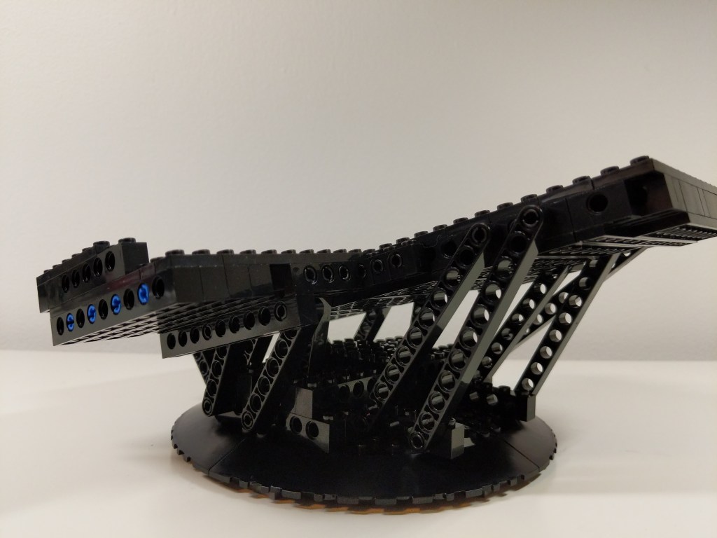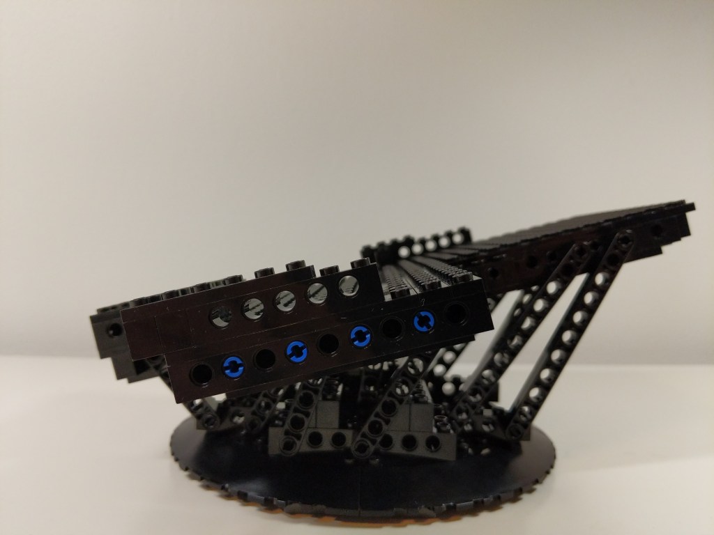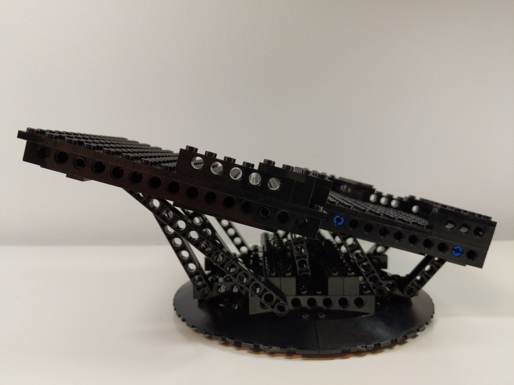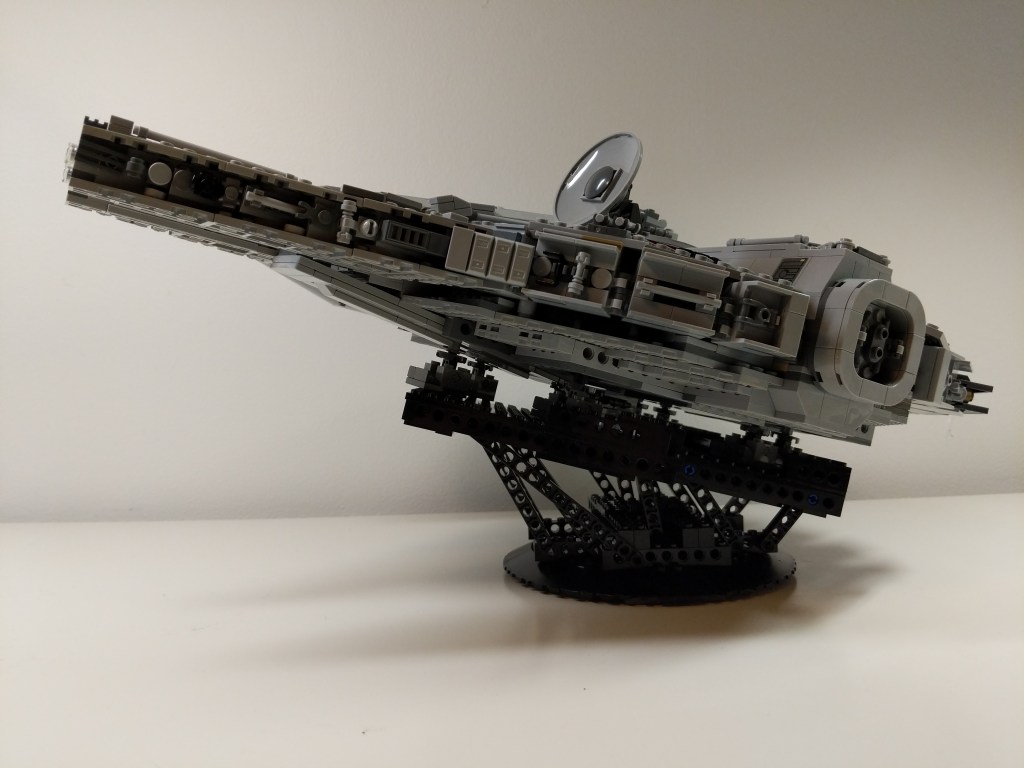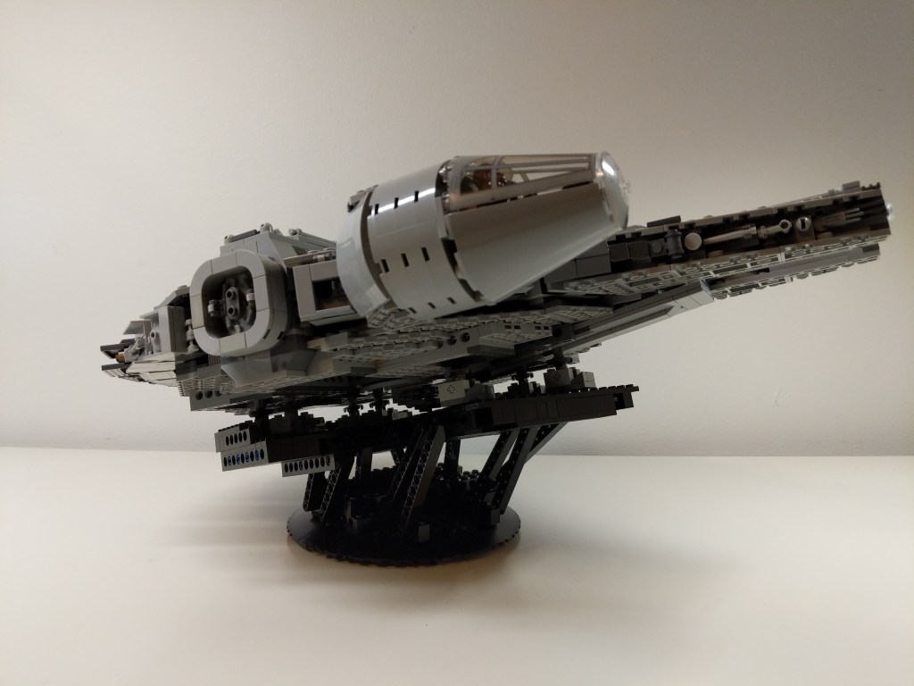 Also, I built an upward sloping display stand for the Falcon shown below. It’s shape combined with gravity locks the Falcon’s landing gear in place so that it can’t move in the display stand. It has a lot of Technic reinforcement due to the weight of the Falcon, which is more than the stock 75257 set.