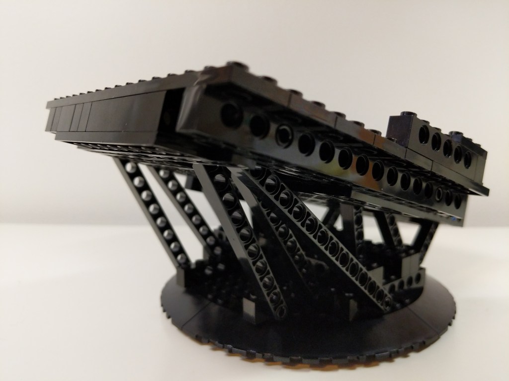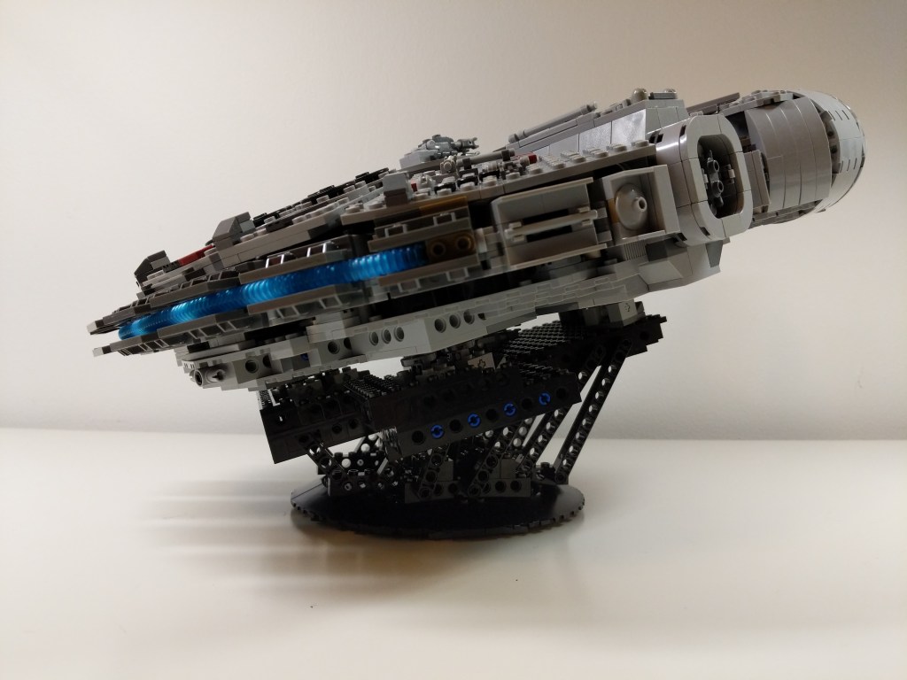 This is a lightweight custom display stand for a stock LEGO 75212 Kessel Run Millennium Falcon from the underrated Solo: A Star Wars Story (2018). Like the stand that I built for my heavier modified Falcon discussed here, it provides an angle upward and a swoop to the left. The landing gear lock into place on the stand and are held in place by gravity.
