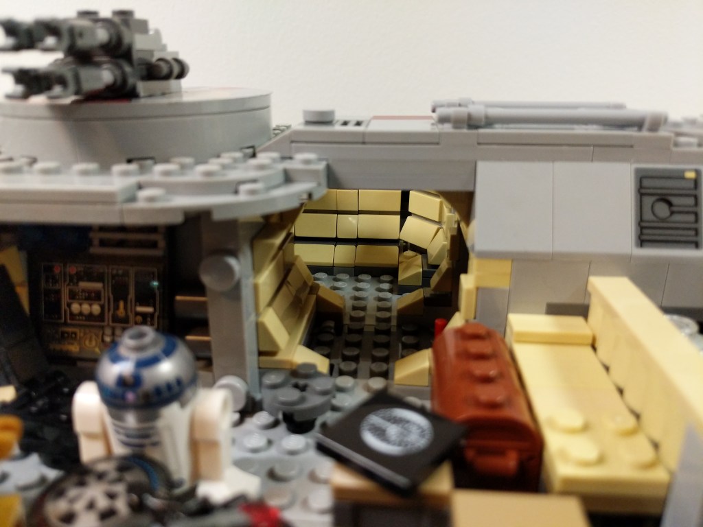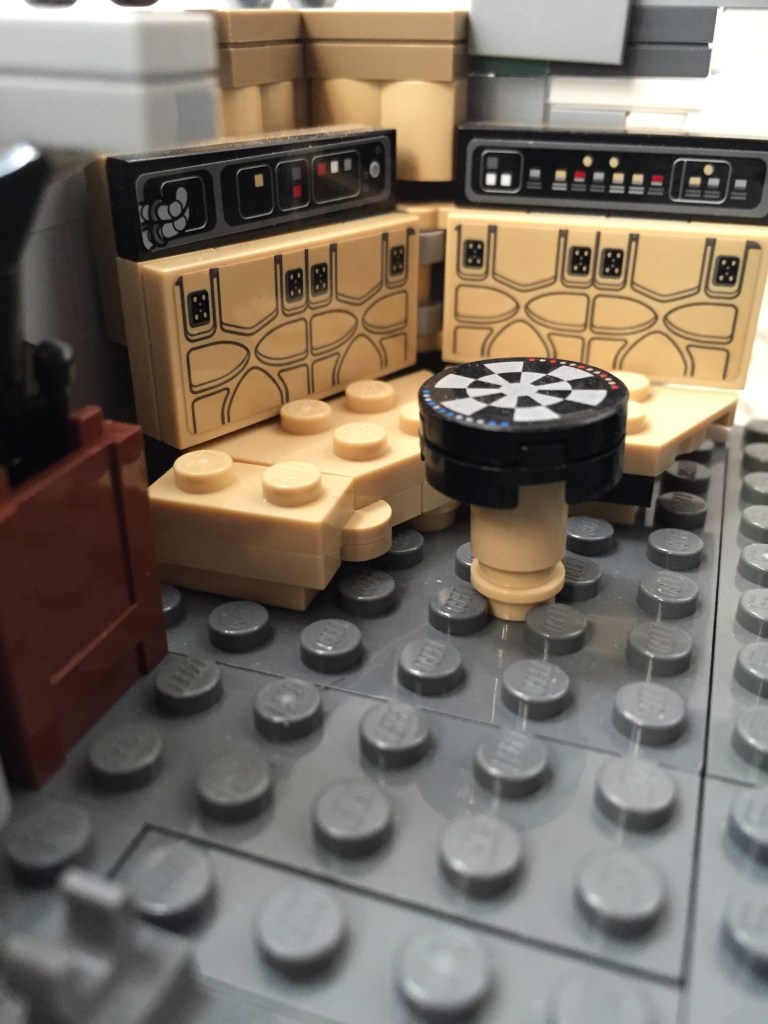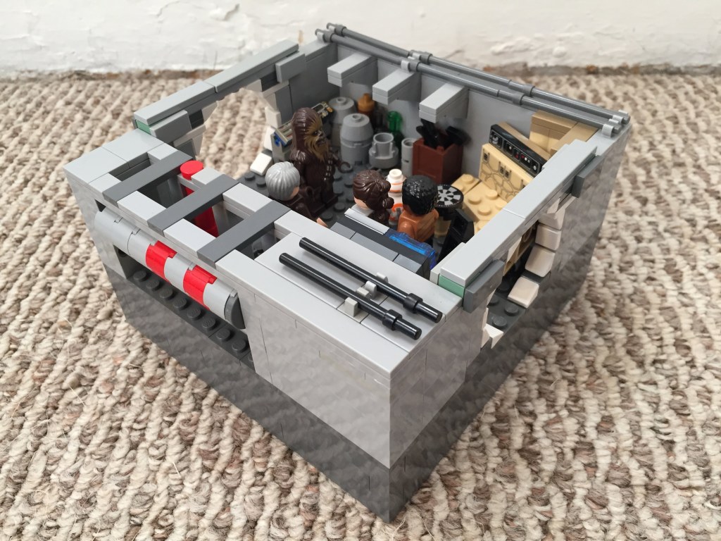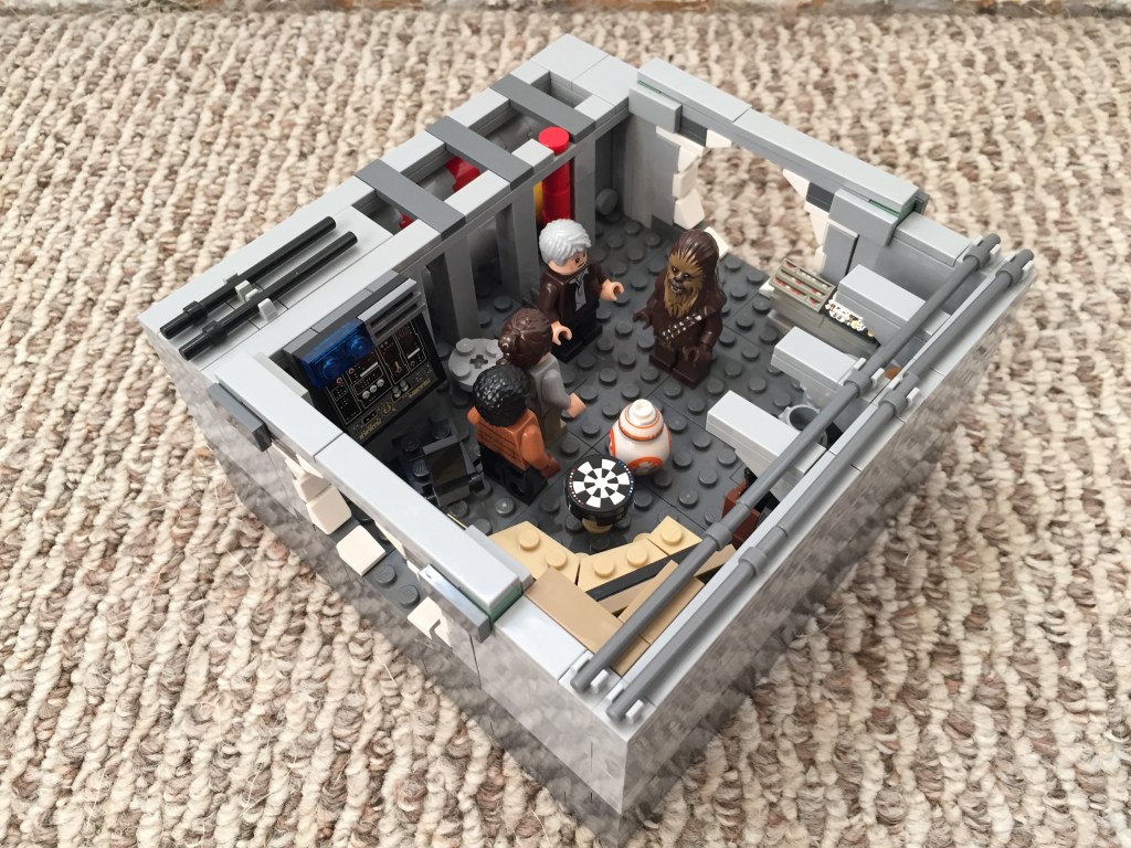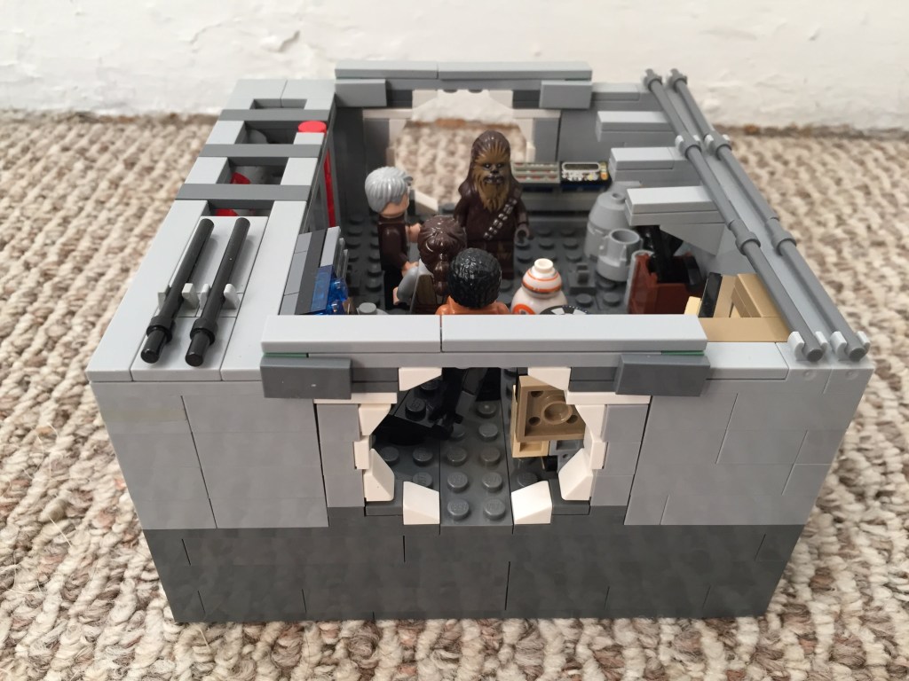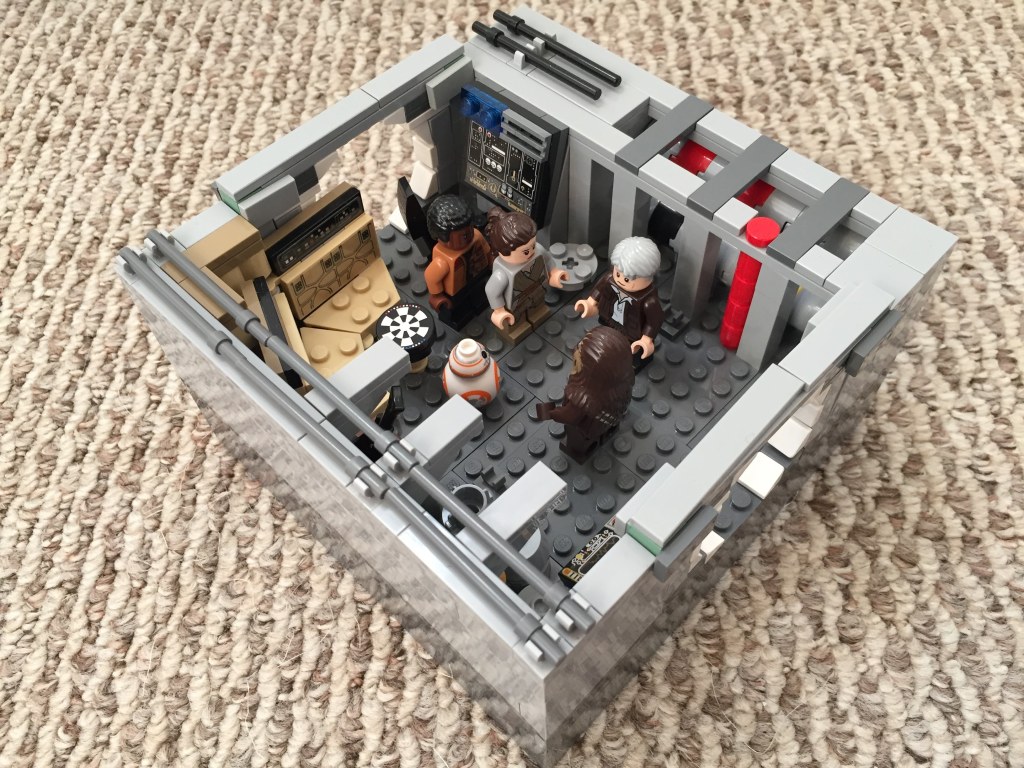I built this 18 x 18 stud diorama of the Millennium Falcon’s main hold that depicts when Han Solo and Chewbacca get to talk with Rey, Finn, and BB-8 in The Force Awakens (2015). I made it sometime before The Last Jedi (2017) premiered. It isn’t 100% accurate due to my wanting the round passage way to create flow for the model (they should be on perpendicular walls). Nevertheless, I fit in important elements of the scene: the seating for the Dejarik table, the Nav computer, the pipes and tanks, Ben Kenobi’s seat while Luke is training, the in-floor repair access, and other equipment seen in the background of the Falcon in the various Star Wars films.