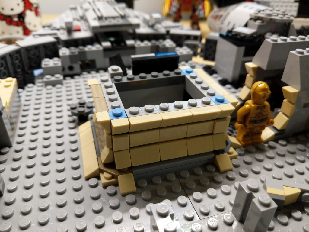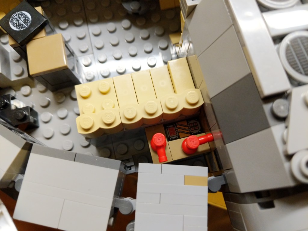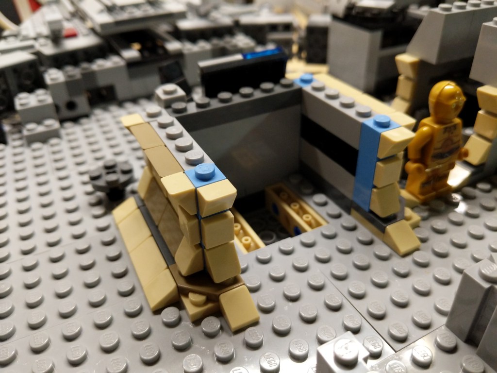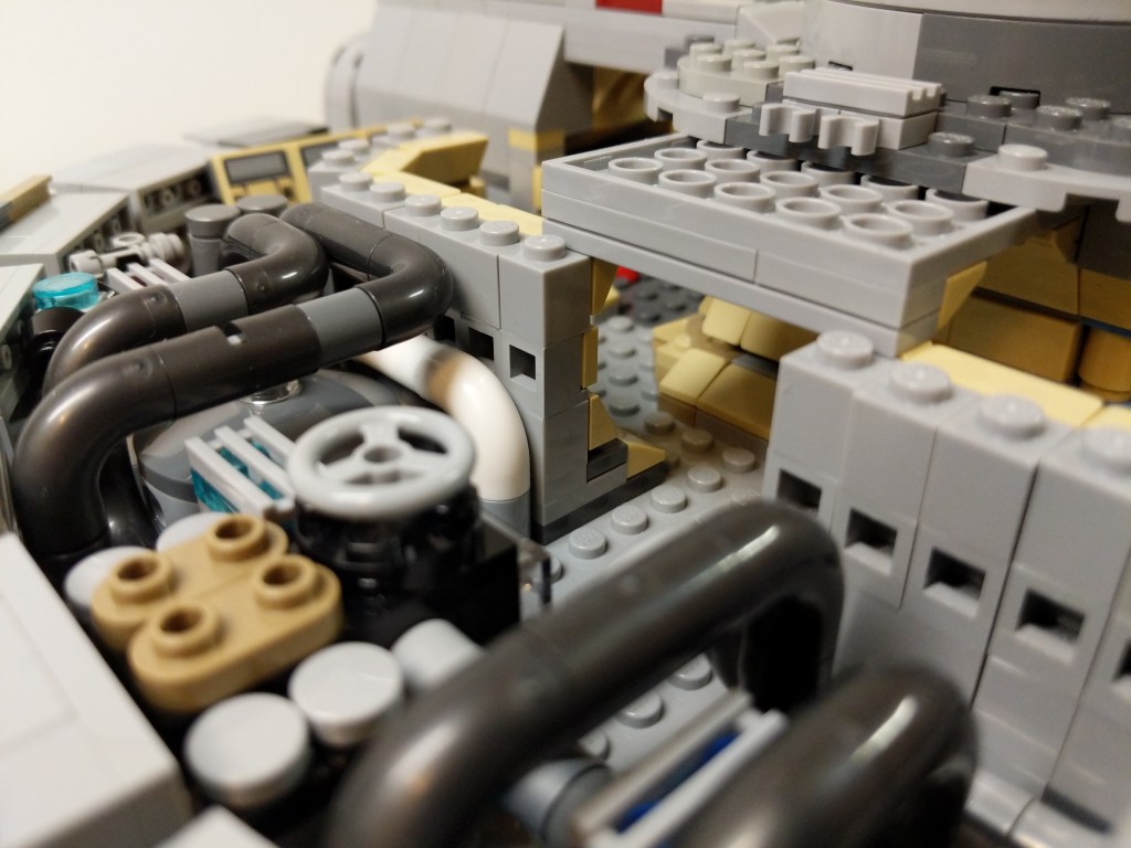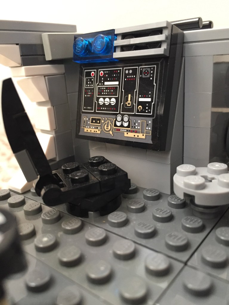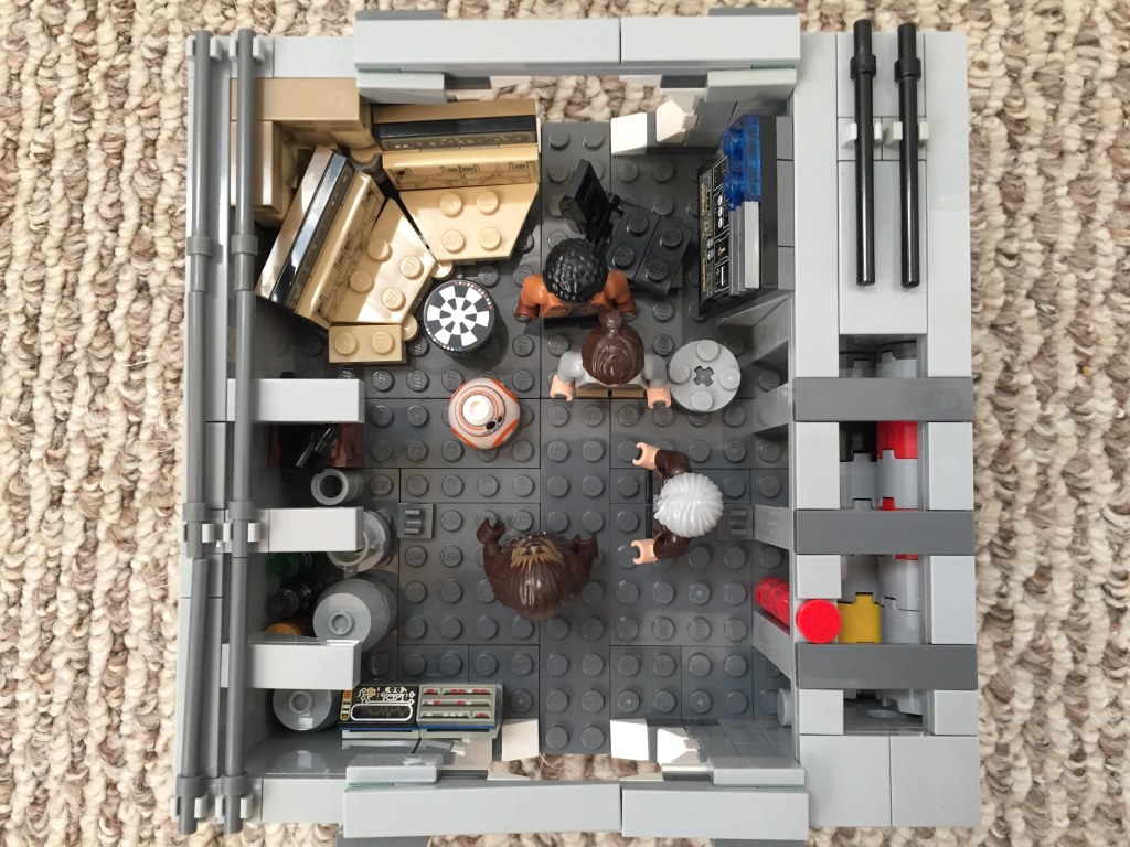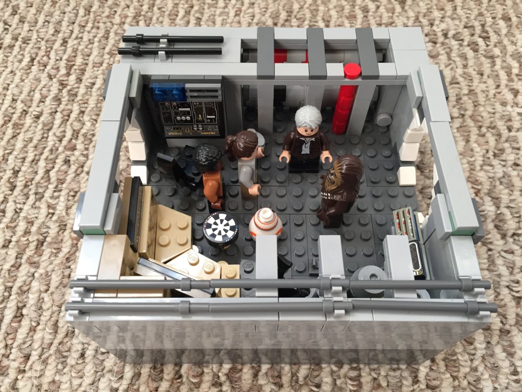 I built this 18 x 18 stud diorama of the Millennium Falcon’s main hold that depicts when Han Solo and Chewbacca get to talk with Rey, Finn, and BB-8 in The Force Awakens (2015). I made it sometime before The Last Jedi (2017) premiered. It isn’t 100% accurate due to my wanting the round passage way to create flow for the model (they should be on perpendicular walls). Nevertheless, I fit in important elements of the scene: the seating for the Dejarik table, the Nav computer, the pipes and tanks, Ben Kenobi’s seat while Luke is training, the in-floor repair access, and other equipment seen in the background of the Falcon in the various Star Wars films.