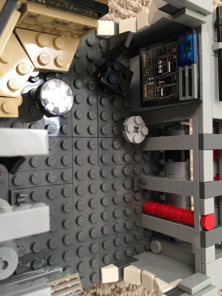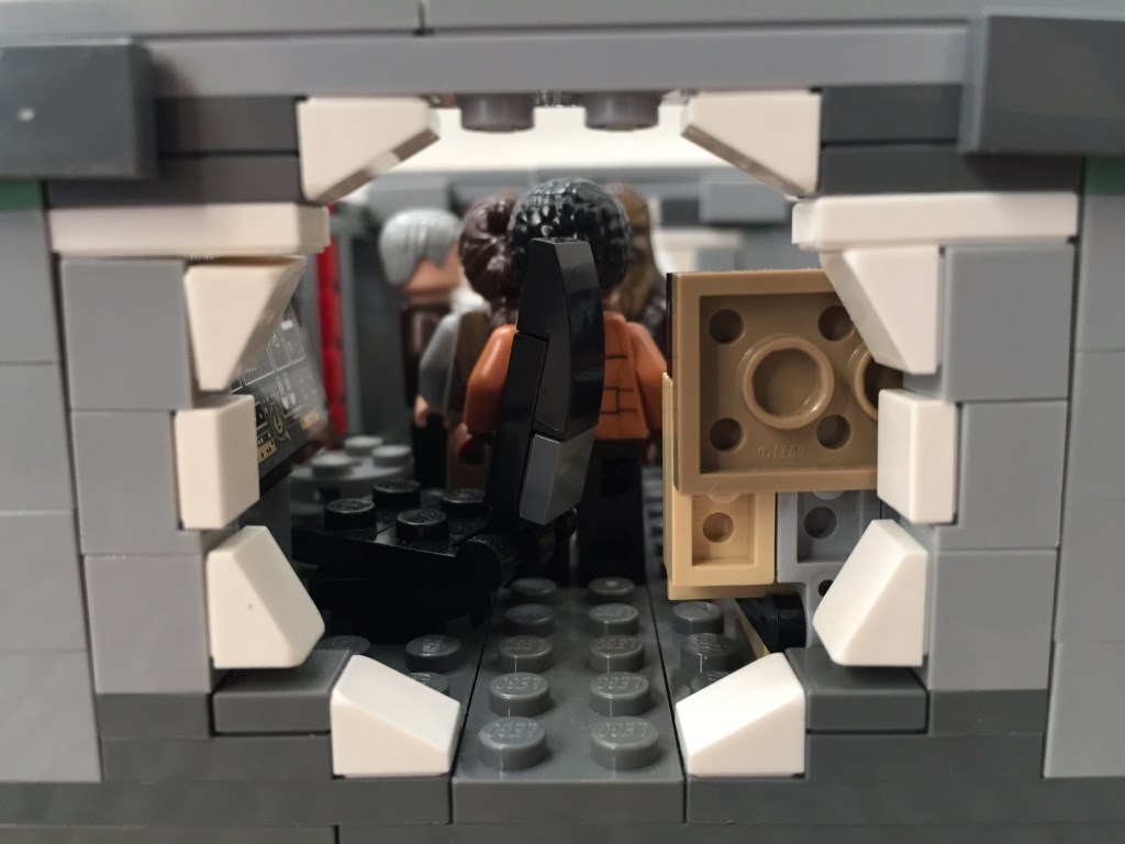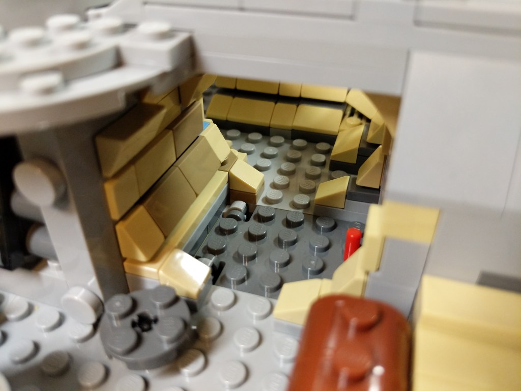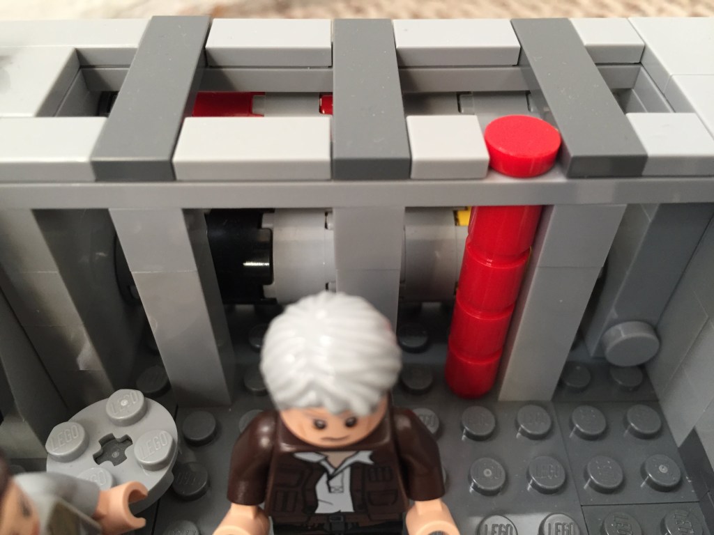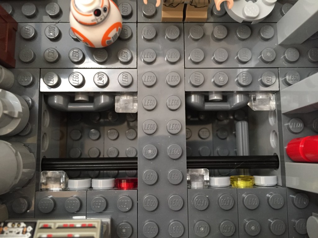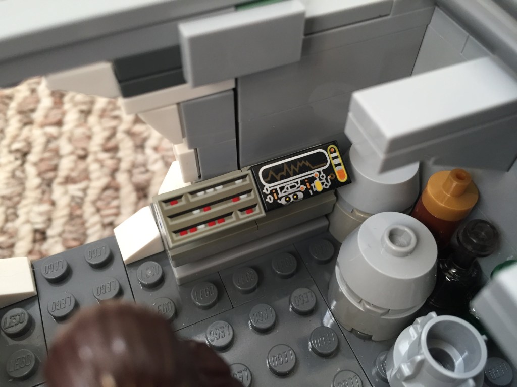 I built this 18 x 18 stud diorama of the Millennium Falcon’s main hold that depicts when Han Solo and Chewbacca get to talk with Rey, Finn, and BB-8 in The Force Awakens (2015). I made it sometime before The Last Jedi (2017) premiered. It isn’t 100% accurate due to my wanting the round passage way to create flow for the model (they should be on perpendicular walls). Nevertheless, I fit in important elements of the scene: the seating for the Dejarik table, the Nav computer, the pipes and tanks, Ben Kenobi’s seat while Luke is training, the in-floor repair access, and other equipment seen in the background of the Falcon in the various Star Wars films.