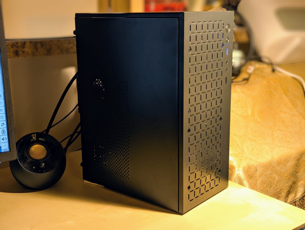 The TGDGAMER 15 liter Micro-ATX case can accommodate mATX and Mini-ITX motherboards. Like old school towers, the PSU is mounted at the top of the case above the motherboard. In this orientation, the PSU draws air from inside the case and pushes it out the back of its housing at the rear of the case.
