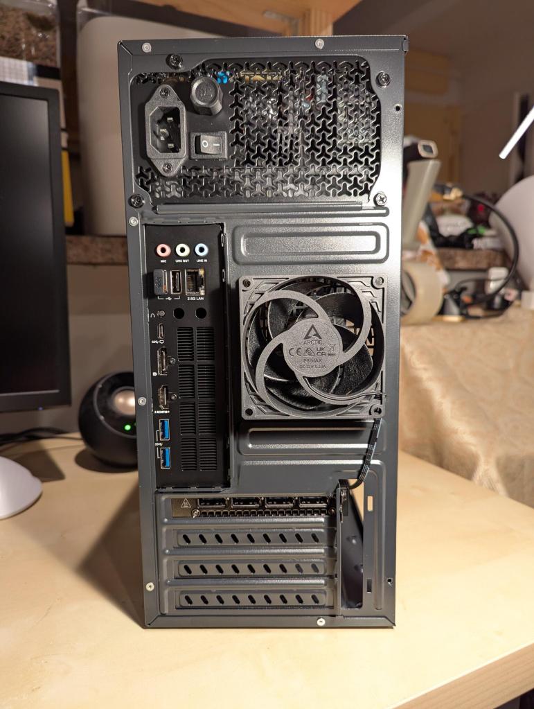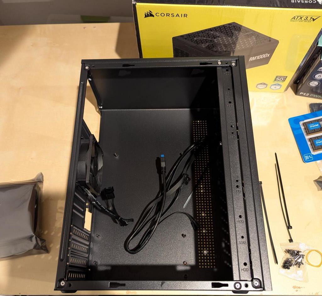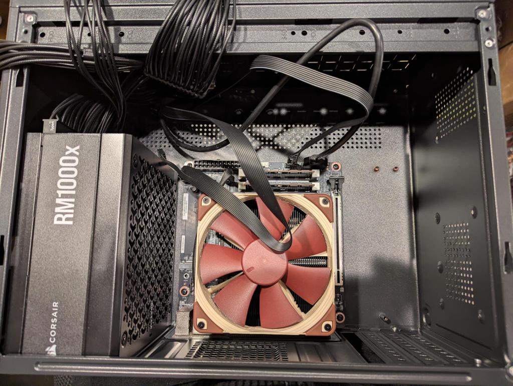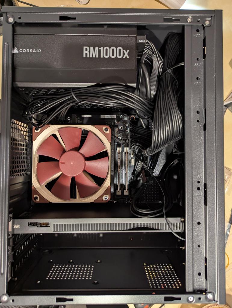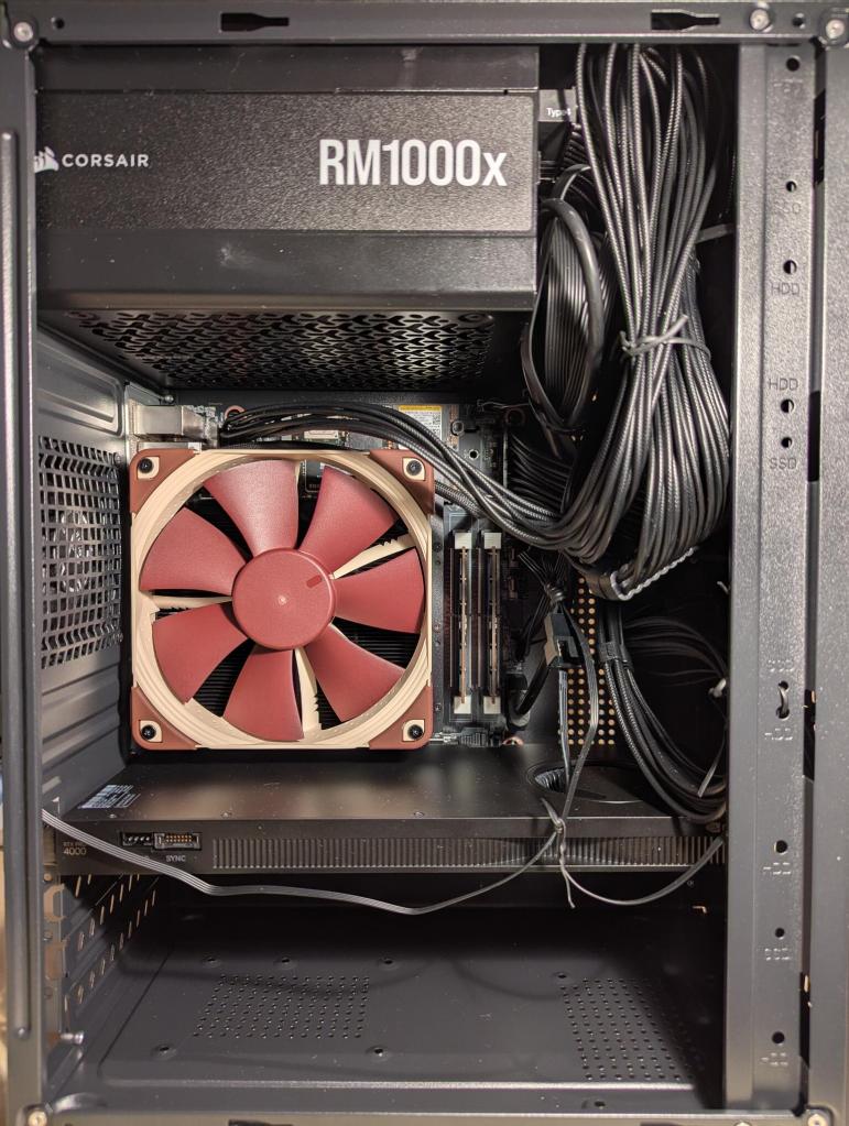 Before installing the PSU, I added one 120 mm Arctic fan to the inside-front of the case in the upper position (there’s room for two 120 mm fans, but my video card is too long to accommodate the second fan).