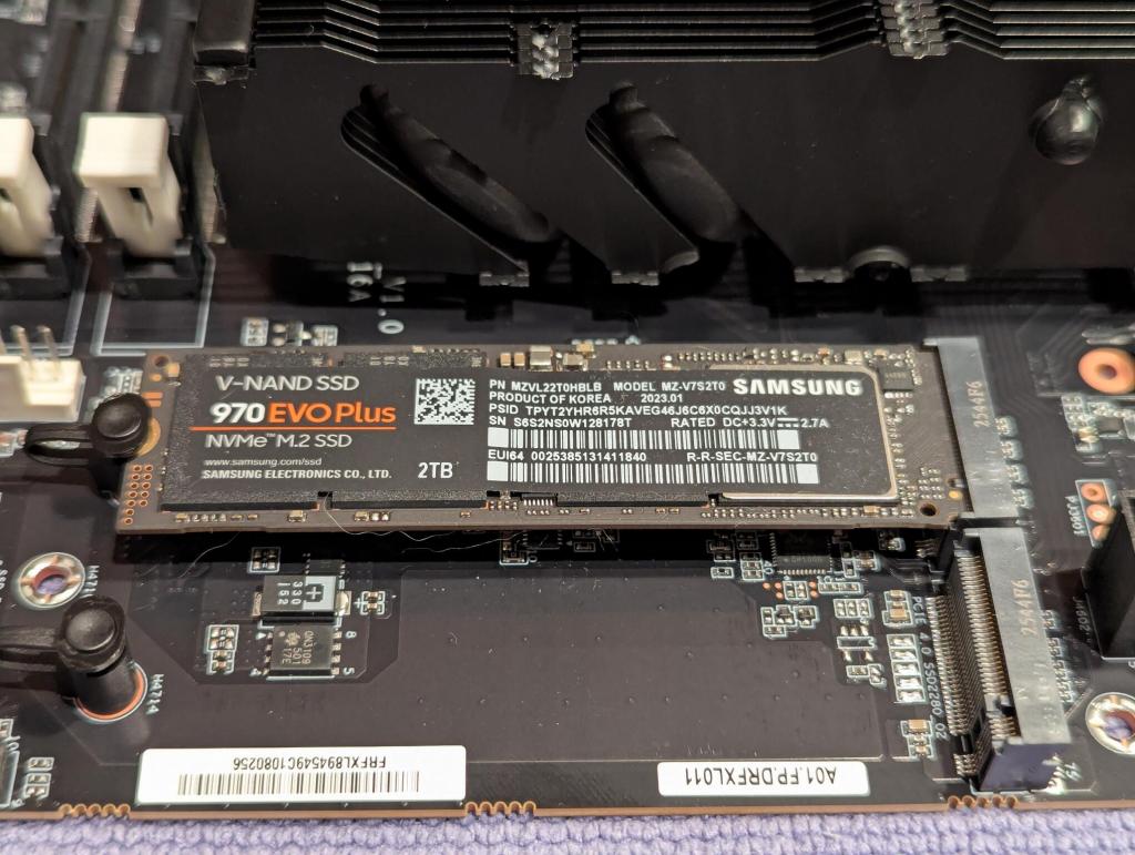 I installed the nvme drives in the two slots at the top edge of the motherboard. The plastic retainer pins are difficult to open with my hands. I used a Gerber multitool’s plyers to grab the wings at the top of the pin and pulled straight up while holding down the board with my other hand. Reinstalling each pin is very easy–just line it up with the hole and press down firmly on the pin until it makes a click sound.