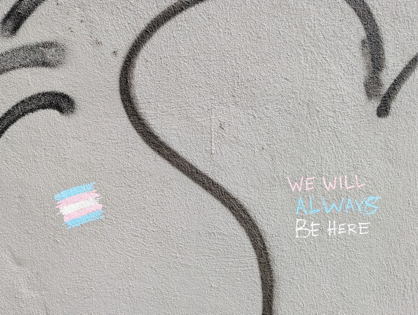 Walking down 3rd Avenue in Brooklyn yesterday, I saw that someone had added something to a larger graffiti: a small transgender flag and the words: “We Will Always Be Here.”